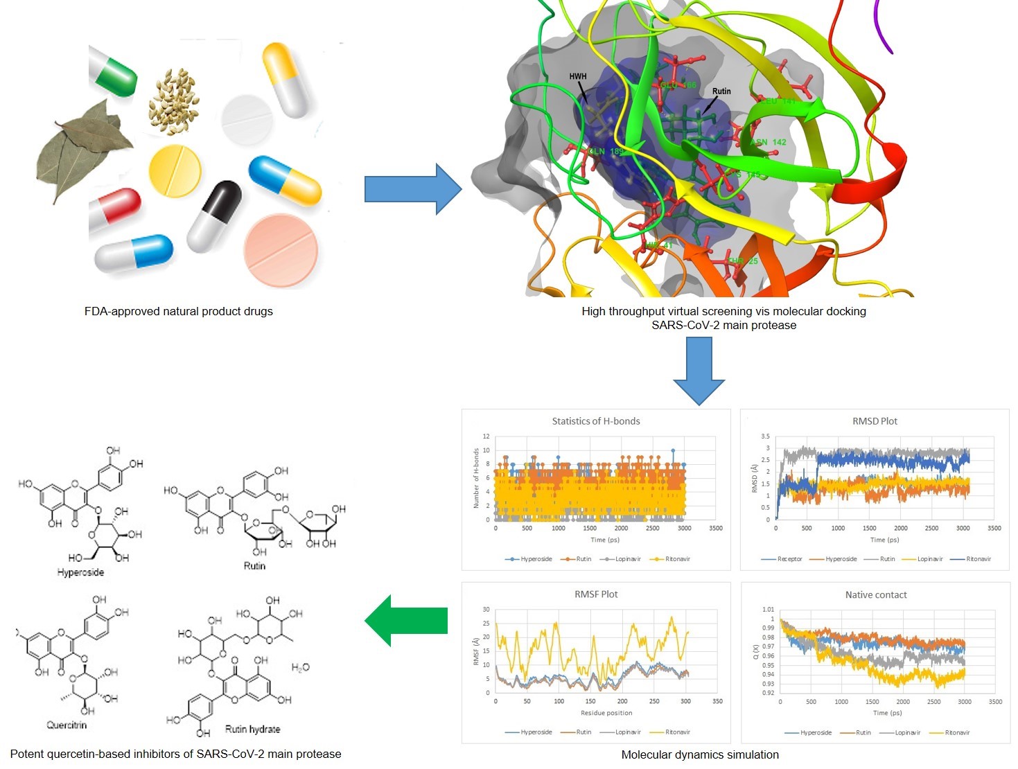 - Hyperoside, rutin hydrate and quercitrin displayed strong binding and stability with the viral main protease