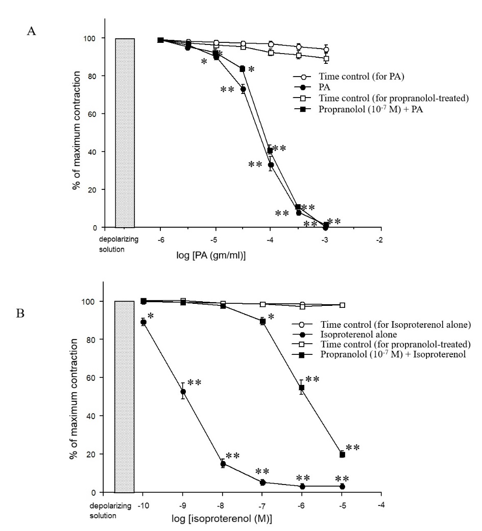This study aimed to investigate the action of crude alkaloid extract from papaya leaves (PA) on the isolated rat myometrium in vitro. The alkaloids were extracted from papaya leaves using conventional acid-base method. The myometrium strips were taken from female Wistar rats pretreated with diethylstilbestrol (100 mg) for 24 h before the experiment. A preliminary experiment has shown that PA had no effect on myometrial contraction. However, PA (10-6 - 10-3 gm/mL) significantly inhibited myometrium contraction pre-contracted with a depolarizing solution in a concentration-dependent fashion. PA (10-5, 3×10-5 or 10-4 gm/mL) or verapamil (10-9, 10-8 and 10-7 M) were able to inhibit the myometrial contractile response to CaCl2 (10-5 - 3×10-2 M) in Ca2+-free solution and cause a rightward shift of log concentration-response curve. PA also significantly inhibited myometrium contraction produced by oxytocin (1 mU/mL), ACh (3×10-5 M) and PGF2a (10-5 M). Furthermore, propranolol (10-7 M) caused no effect on uterine relaxation induced by PA (10-6 - 10-3 gm/mL), although it inhibited uterine relaxation induced by isoproterenol (10-10 - 10-5 M). These results indicated that PA was a uterine relaxant. Its mechanism of action may be unrelated to stimulation of b2-adrenergic receptors of the uterus. This action may be contributed to mainly the Ca2+ influx, possibly through voltage-operated Ca2+ channel on the plasma membrane, and to a lesser extent by a rise in Ca2+ release from internal storage. However, the action of PA at intracellular sites, downstream of Ca2+ influx such as the contractile machinery of the myometrium, cannot be excluded.