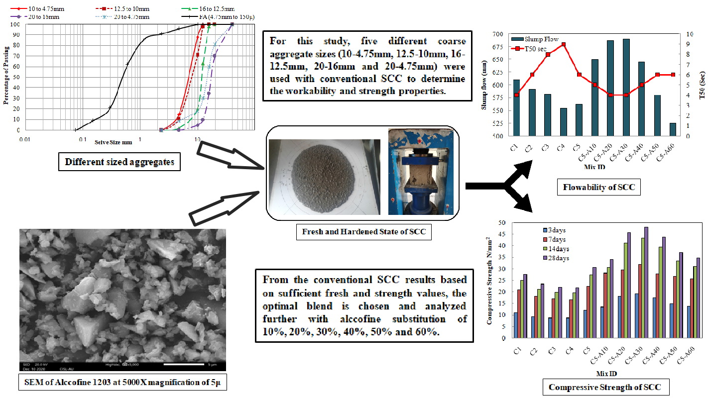 The findings of an experiment examining the efficacy of different size of coarse aggregates on the fresh and strength properties of Self-Compacting Concrete (SCC) and Alccofine based SCC are described in this article. For this study, 5 different coarse aggregate sizes (10 - 4.75, 12.5 - 10, 16 - 12.5, 20 - 16 and 20 - 4.75 mm) were used with conventional SCC to determine the workability and strength properties. The water to binder ratio of 0.4 is maintained for all mixtures. Workability properties like slump-flow, T50 time, V-funnel and L-box tests and hardened property of compressive strength were studied. From the conventional SCC results based on sufficient fresh and strength values, the optimal blend is chosen and analyzed further with Alccofine substitution of 10, 20, 30, 40, 50 and 60 %. The test results revealed that the maximum size of aggregate did not influence much on the workability. Whereas the combination of aggregate sizes with the replacement of cement by 30 % of Alccofine had given optimum results on fresh and strength properties. Also, a numerical analysis was carried out, with Finite Element Modeling (FEM) to analysis the compressive strength and compared them to experimental findings. The consequence of FEM shows it is a reliable technique to validate experimental data.