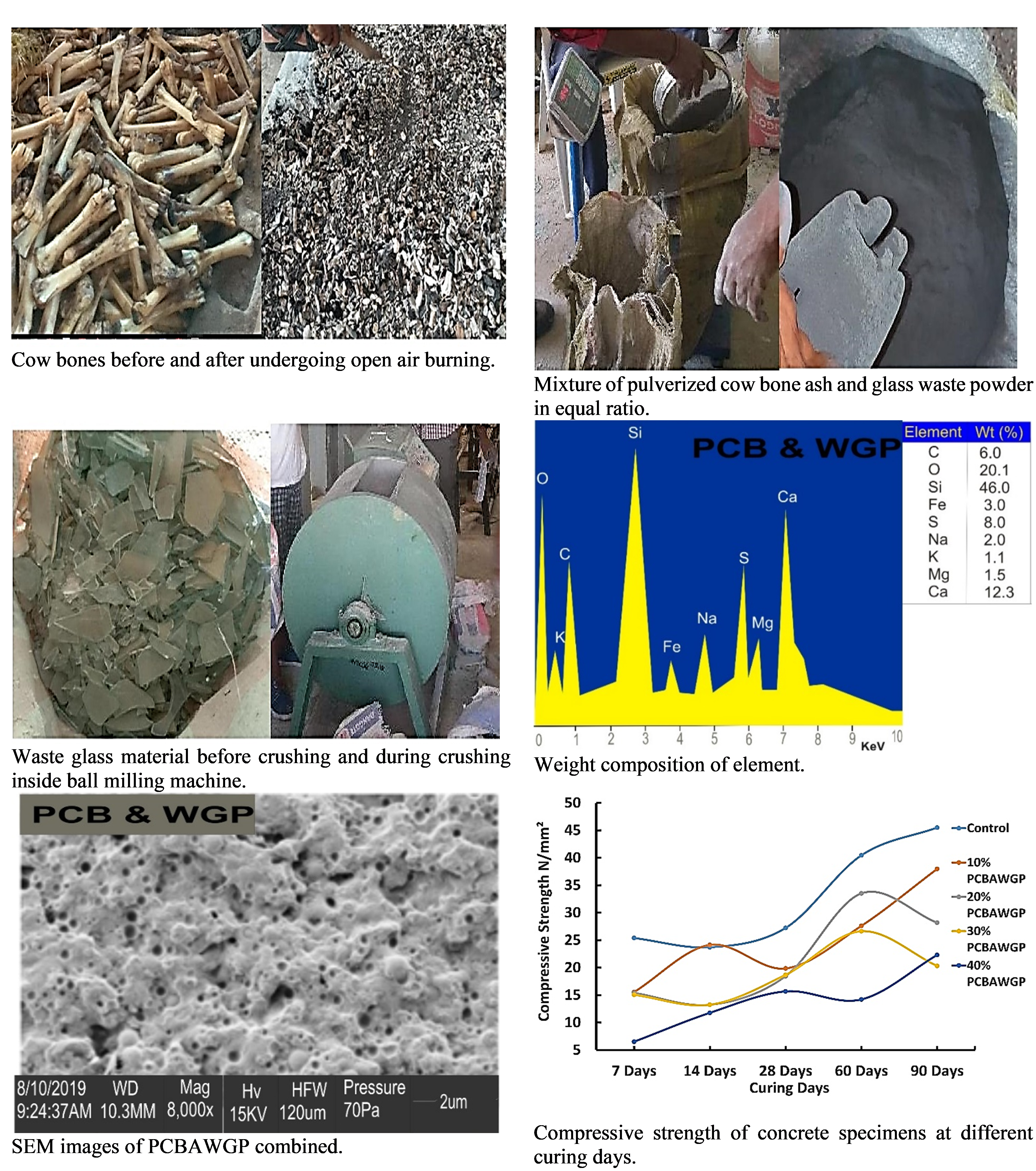 - The compressive strength of concrete reduces as % pulverized cow bone ash and waste glass powder PCBAWGP increases. The compressive strength generally increases with increase in age of curing. The minimum and maximum compressive strength of concrete at 10 and 40 % PCBAWGP content for 1:2.17:3.4 concrete mix ratio at 28- and 90-days curing age are 19.85, 37.98 N/mm2 and 15.68, 22.31 N/mm2, respectively