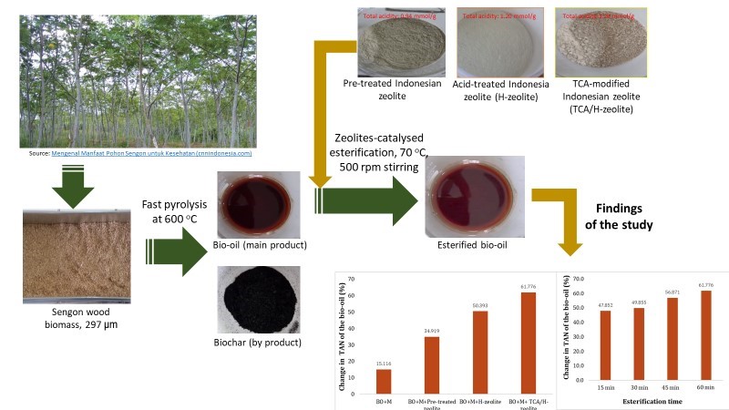 - The presence of the TCA/Indonesian natural zeolite during the esterification of bio-oil produced from the pyrolysis of Sengon wood could greatly suppress the severe repolymerisation leading to coke formation