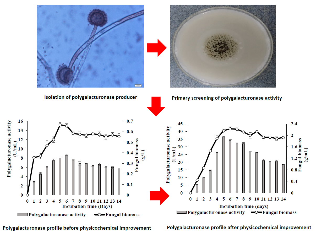 - This research paper highlighted the capability of indigenous fungus (Aspergillus) to produce polygalacturonase. The finding revealed that the improved physicochemical conditions including agitation speed, inoculum size, the concentration of pectin, and incorporation of yeast extract in the culture medium could enhance polygalacturonase production by up to 74.63 % (34.21 ± 0.49 U/mL). The improved physicochemical conditions not only enhance the polygalacturonase production but shorten the incubation period to obtain optimum enzyme production.