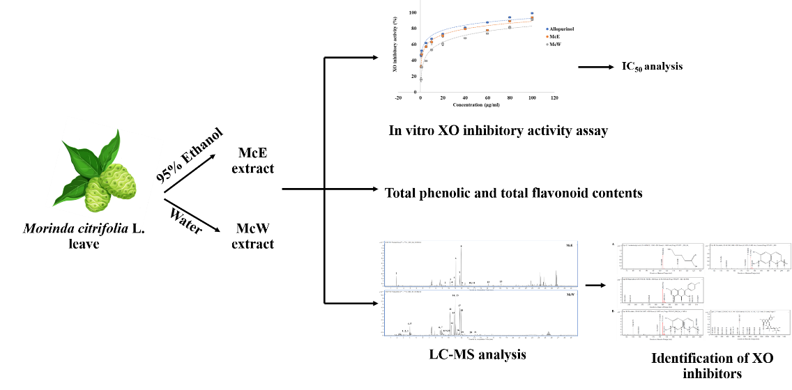 Hyperuricemia causes an excessive level of uric acid in the body, which leads to the formation of gouty arthritis and high uric acid-related diseases. To cure this condition, xanthine oxidase (XO), a key enzyme in uric acid production, was targeted. A routinely used XO inhibitor drug, allopurinol, has side effects. Therefore, an alternative XO inhibitor with a high activity and fewer side effects is strongly desired. In this research, we evaluated the XO inhibitory activity of Morinda citrifolia L. (noni) leaves extracted using 2 solvents, 95 % ethanol and water. The total phenolic and flavonoid content was analyzed. Moreover, the phenolic profile was investigated using liquid column chromatography-mass spectrometry (LC-MS). The results showed that at a concentration of 100 µg mL−1, the ethanolic (McE) and water (McW) extracts could exhibit XO inhibitory activity above 90 %, and the IC50 values predicted using dose-response logarithmic function curves were 2.24 ± 0.2 and 7.2 ± 0.1 µg mL−1, respectively, while the IC50 of allopurinol was 1.02 ± 0.1 µg mL−1. The total phenolic and flavonoid content in McE was higher than that in McW. LC-MS analysis revealed that all extracts contained several phenolic compounds. Interestingly, known potent XO inhibitors were found in both extracts. Kaempferol, esculetin, saponarin, physcion and g-aminobutyric acid were found in McE, while McW contained esculetin, saponarin and rutin. Taken together, M. citrifolia L. leaves could be used as an effective alternative XO inhibitor for curing hyperuricemia and high uric acid-related diseases caused by XO activity.