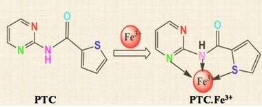 By using UV-Visible and fluorescence measurements, a new chemosensor N-(pyrimidin-2-yl) thiophene-2-carboxamide (PTC) was introduced for the discriminating and responsive detection of Fe3+ in aqueous methanolic medium. Since the PTC-Fe3+ complexation occurred in 1:1 binding stoichiometry, the receptor PTC preferentially revealed a charge transfer band between 310 to 475 nm in the UV-Vis technique, with the absorption peak at 351 nm. Furthermore, the fluorescence technique, which dampened PTC's fluorescence emission band at 325 nm, showed similar selectivity. The Stern-Volmer graphic shows that fluorescence quenching occurs in a static manner. The series of examined metal ions (Na+, K+, Li+, Cs+, Fe2+, Ni2+, Sr2+, Cu2+, Cd2+, Pb2+, Co2+, Hg2+, Ba2+, Mg2+, Mn2+, Ca2+, Zn2+, Cr3+, Ag+ and Al3+) failed to perturb the UV-Vis and fluorescence of PTC. With PTC, the concentration of Fe3+ can be detected down to 2.03 and 1.24 µM by UV-Vis and fluorescence methods, respectively.
