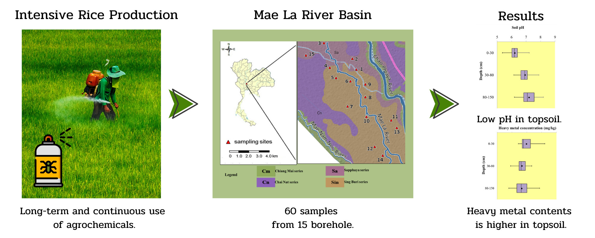 - Long-term and continuous use of agrochemicals in rice production has resulted in lower pH and higher heavy metal contents in topsoil