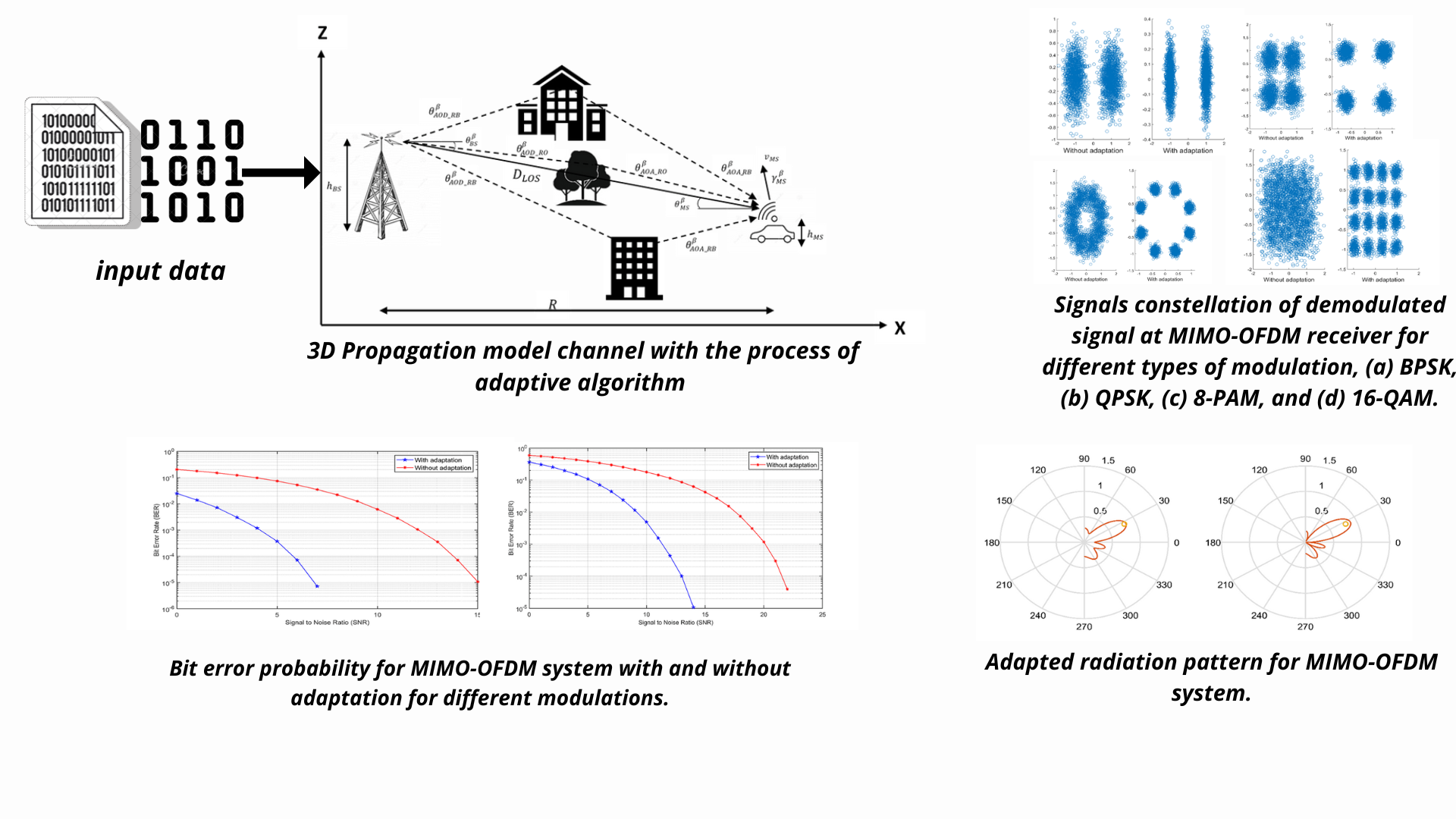 - Effective adaptive algorithm processing in 3D wireless networks based on SISO-OFDM and MIMO-OFDM WiMAX was proposed, enabling network performance to be enhanced in the case of non-LOS wireless communications, which are standard in urban conditions. On the performance of the system, signal attenuation, the effects of several paths, different mobility speeds and Doppler shift were studied