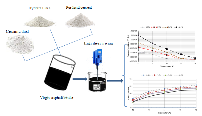- Portland cement, ceramic dust and hydrate lime modifiers mixed together with different contents into asphalt binder during a modification process in order to find out asphalt binder which corresponds to rutting resistance