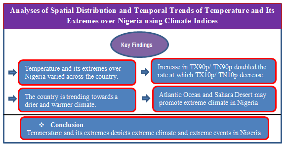 - Spatial distribution of temperature and its extremes over Nigeria varied across the country from one region to another