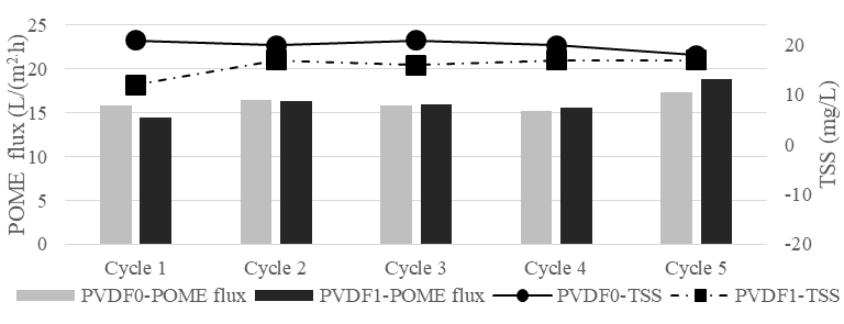 - POME flux was maintained at ~16 L/(m2.h) for 5 cycles of filtration process