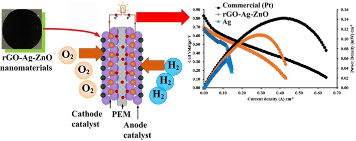 - Reduced graphene oxide coated Ag-ZnO nanomaterials formed by Callistemon viminalis, low-cost PEM fuel cell which uses rGO-Ag-ZnO nanoparticle.