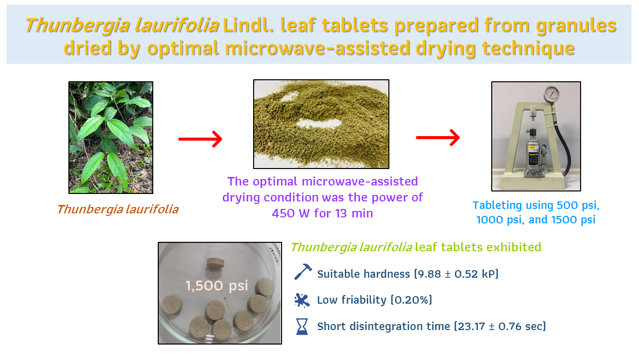 Thunbergia laurifolia Lindl. is a medicinal plant that belongs to the family of Acanthaceae. It possesses several biological and pharmacological activities. According to the Thai National List of Essential Medicines, T. laurifolia leaves are used for the treatment of fever. This work sought to optimize microwave-assisted drying of Thunbergia laurifolia Lindl. leaf granules to shorten the granule drying process by the 32 full factorial design. Power was varied from 300, 450 and 600 W for 5, 10 and 15 min, to minimize moisture content and maximize rosmarinic acid content. Results showed that the optimal microwave-assisted drying condition within the design space and control space was the power of 450 W for 13 min. This condition gave the moisture content of 4.77 ± 0.24 % and rosmarinic acid content of 0.0566 ± 0.0075 %. The HPLC method was validated; it showed good linearity, specificity, precision, and accuracy. Furthermore, the system suitability was achieved. The T. laurifolia leaf granules obtained from the optimal microwave-assisted drying condition were further used to prepare T. laurifolia leaf tablets by the wet granulation method. Three batches of 650 mg tablets containing 250 mg of T. laurifolia leaf powder were prepared using different compression forces: 500, 1,000 and 1,500 psi. The suitable compression force was 1,500 psi; the tablet formulation had suitable hardness (9.88 ± 0.52 kP), low friability (0.20 %), and a short disintegration time (23.17 ± 0.76 s). Rosmarinic acid marker was dissolved from the tablets for approximately 75 % within 4 h when 0.5 % sodium lauryl sulfate aqueous solution was used as dissolution medium. In conclusion, microwave-assisted drying could be applied in preparing T. laurifolia leaf tablets by shortening the granules drying time.