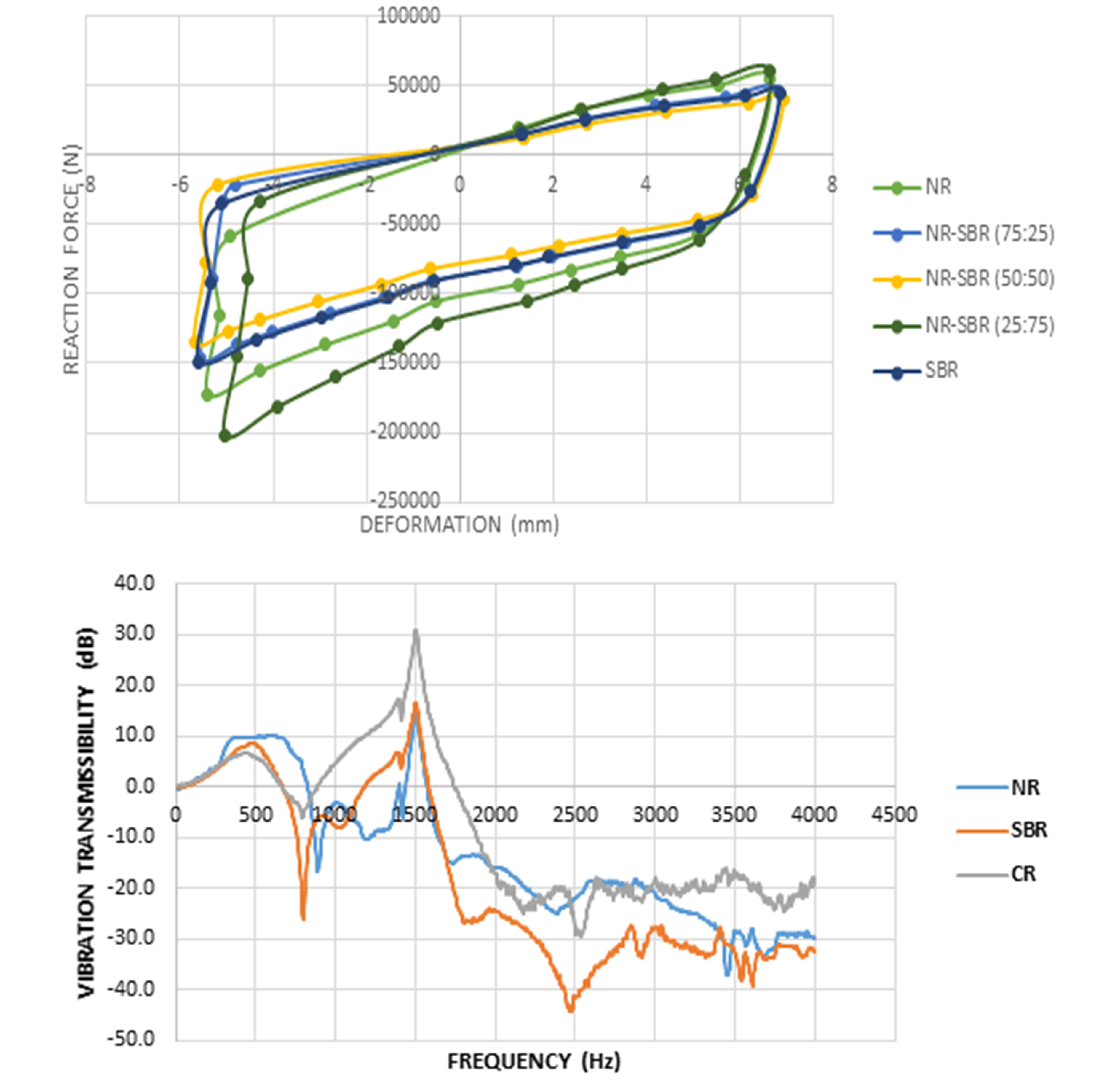 - The transmissibility curve of the elastomers was plotted at different frequencies ranging from 10 - 4000 Hz using a vibration exciter and the loss factor was calculated using half power band width method