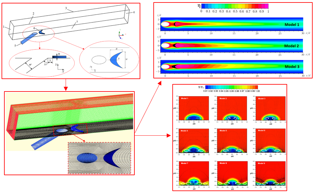 - Film cooling performance is considerably enhanced by placing a crescent shaped block downstream the injection hole