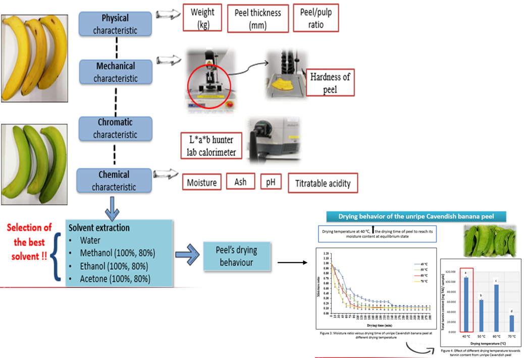 Musa acuminata (Cavendish) peel is a waste product of limited values that is generated in large quantities and caused detrimental environmental issues in long term if there are no alternative solutions. This primary residue corresponds to 40 % of the fruit weight with a broad natural antioxidant such as polyphenols that will be valuable to the food industry application. This study aimed to investigate the physicochemical characteristics and solvent extraction for high polyphenols recovery between unripe and ripe peel following the drying characteristic and quantification analysis. The physicochemical characteristics of Cavendish peel showed significant differences at different ripening stages, thus effect the solvent extraction towards antioxidant compounds and activities. An aqueous extract of unripe peel was the best solvent for higher phenolic, tannin and flavonoid content compared to ripe peel. The 40 °C of drying treatment will preserve higher tannin content than other temperature and eleven profile of polyphenols had been detected using HPLC including tannic acid as a lead compound. The results from this study can be used for further isolation and purification of tannin to the possible application as functional food ingredients due to its antioxidants benefits and conversion of this residues as valuable is necessary.