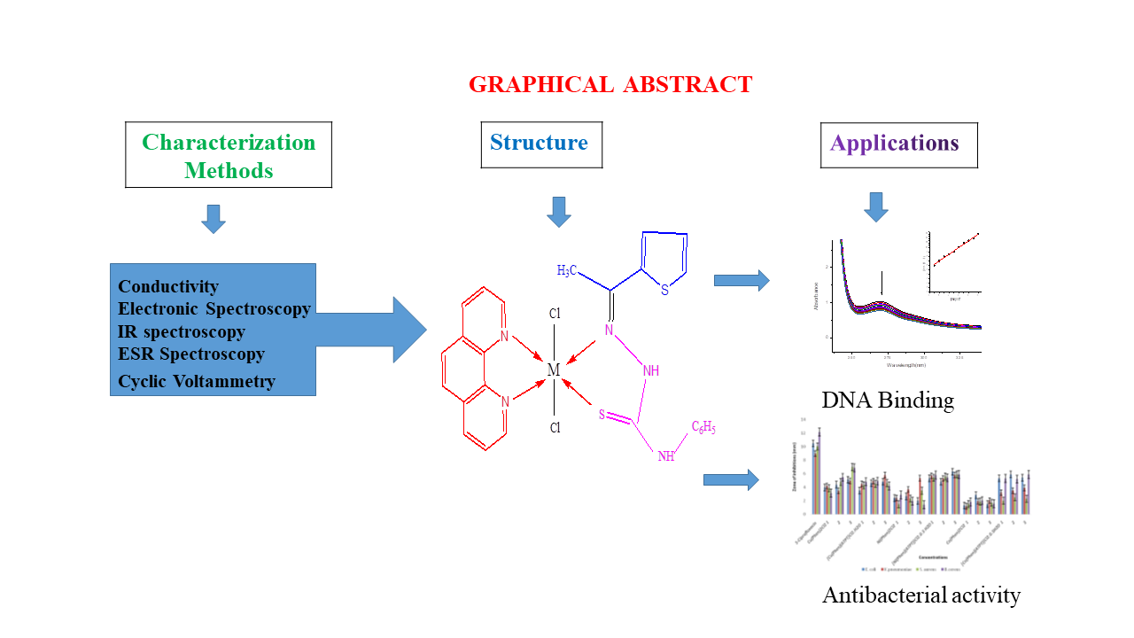 Bivalent metal complexes having the composition M(Phen)Cl2 (where, M = Cu(II), Ni(II) and Co(II); Phen = 1,10-Phenonthroline) are reacted with 2-acetylthiophene-4-phenyl-3-thiosemicarbazone (ATPT) to produce ternary complexes with molecular formula [M(Phen)(ATPT)Cl2] H2O. The complexes are characterized using physical (molar conductivity) and spectral (mass spectra, infrared and electronic spectroscopies) methods. Electrochemical behavior of complexes was uncovered using cyclic voltammetry. DNA binding properties of the complexes are determined by using absorption UV-Visible spectrophotometry. Metal complexes are screened for their antibacterial activity by using agar well diffusion method against pathogenic bacterial strains viz. Gram–ve such as Escherichia coli, Klebsiella Pneumonia and Gram+ve such as Staphylococcus aureus, Bacillus cereus. The [Ni (Phen)(ATPT)Cl2] 0.5 H2O complex inhibits bacteria more stronger than any other complex.