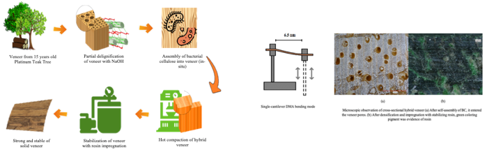 - A heating press compacted densified wood veneer with bacterial cellulose (BC), forming in hybrid veneers