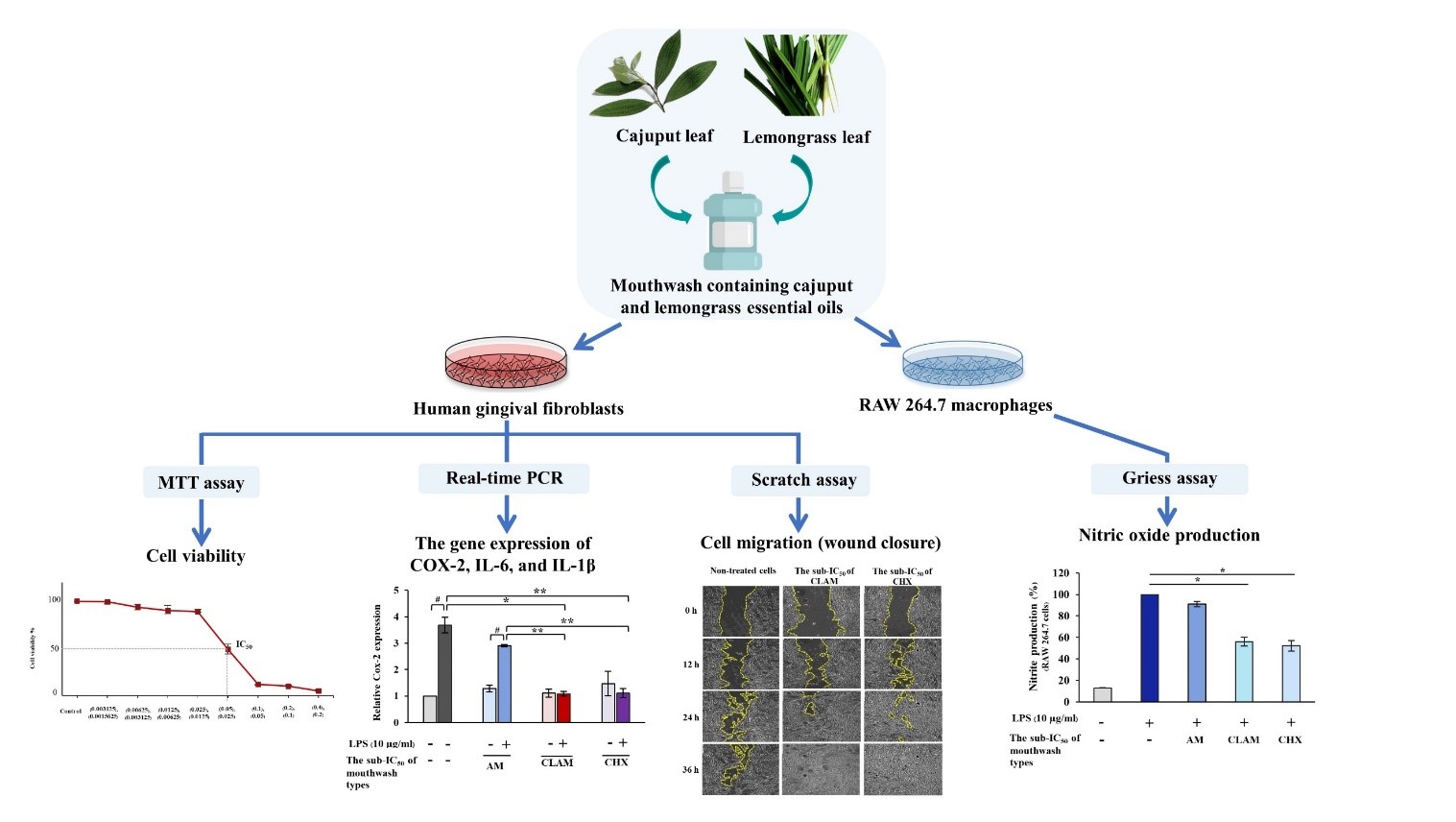 - Cajuput and lemongrass essential oils supplemented in alcohol-free mouthwash expressed anti-inflammatory activity by inhibiting nitric oxide production in LPS-activated RAW 264.7 macrophages and reducing COX-2, IL-6 and IL-1β expression in LPS-activated HGFs, as well as by promoting oral wound healing, similar to chlorhexidine mouthwash, which is a common, well-known agent in dental treatment