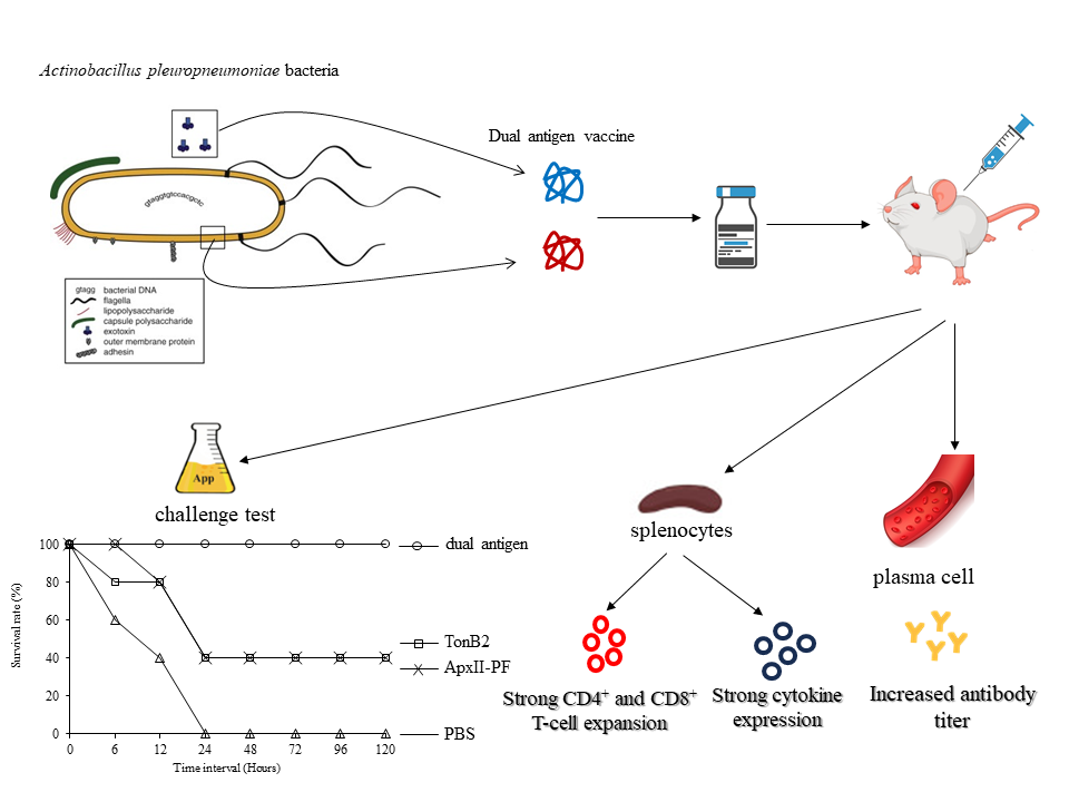 - The dual antigen vaccine of Actinobacillus pleuropneumonia (ApxII pore - forming domain and TonB2-the nutritional immunity antigen) were formulated as vaccines