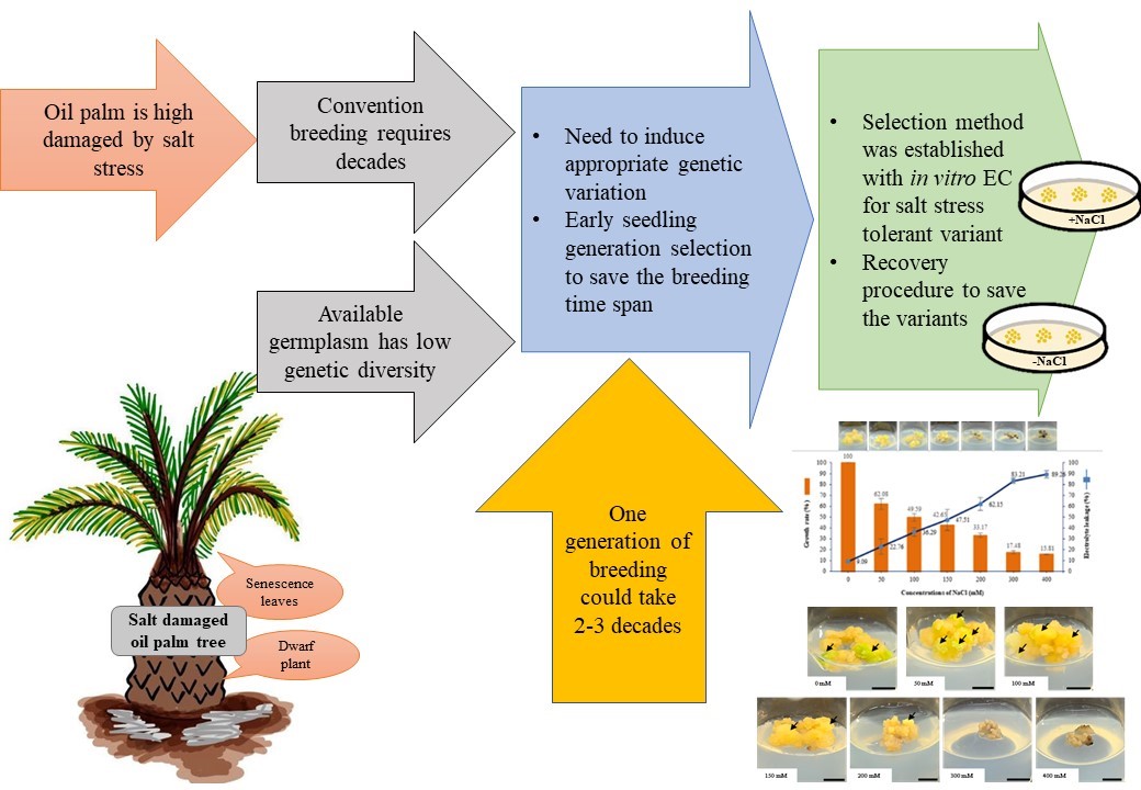 Evapotranspiration, which includes the evaporation of water from soils, may rise as a result of climate change and rising temperatures. The outcome is that water evaporates but salt stays in the soil, raising its saltiness. The growth and development of oil palm are also affected by salt stress, but decades of time frame are required with conventional breeding due to its reproductive biological reasons and its long-time life span. However, to facilitate stress tolerance evaluation at an early stage of plant material, the in vitro selection was considered, and the evaluation process was optimized for innovating variant selection out from calluses over abiotic stress. Thus, the objectives of this research were to study the effect of concentrations of sodium chloride (NaCl) on the growth rate, electrolyte leakage (EL) and proline content of embryogenic callus (EC) of oil palm ‘SUP-PSU1’. Was also, recovery of EC growth after treating with NaCl for further evaluation to set new variant tolerant line for breeding was established. EC was treated with different concentrations of NaCl in oil palm culture medium (OPCM) supplemented with 0.1 mg L–1 3,6-Dichloro-o-anisic acid (dicamba) and 200 mg L–1 ascorbic acid (AA) for 4 weeks. The results showed that inhibition concentration at 50 % (IC50) was 149.1 mM and NaCl at high concentrations increased EL and proline content. After transferring treated EC to solidified medium without NaCl for 4 weeks, The 200 mM condition’s EC turned yellowish-brown and couldn’t withstand higher (300 and 400 mM) NaCl concentrations. The lowest growth rate was obtained with NaCl at 300 and 400 mM, and the EC entirely turned brown. So, it was judged that NaCl concentration around 300 to 400 mM can be used as a selection agent for ‘SUP-PSU1’ new variant tolerant line in oil palm tissue culture breeding condition.
