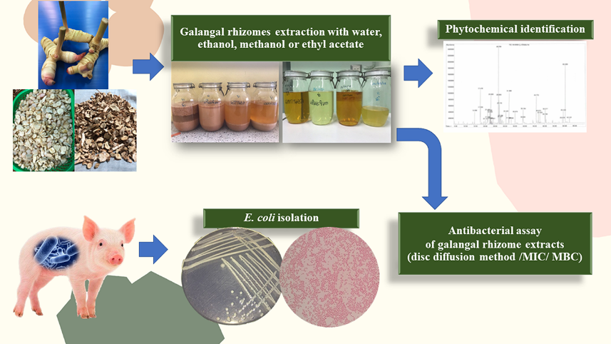 - The galangal rhizome extracted with ethyl acetate exhibited a strong antimicrobial effect against E. coli K88, which known to cause diarrhea in piglets