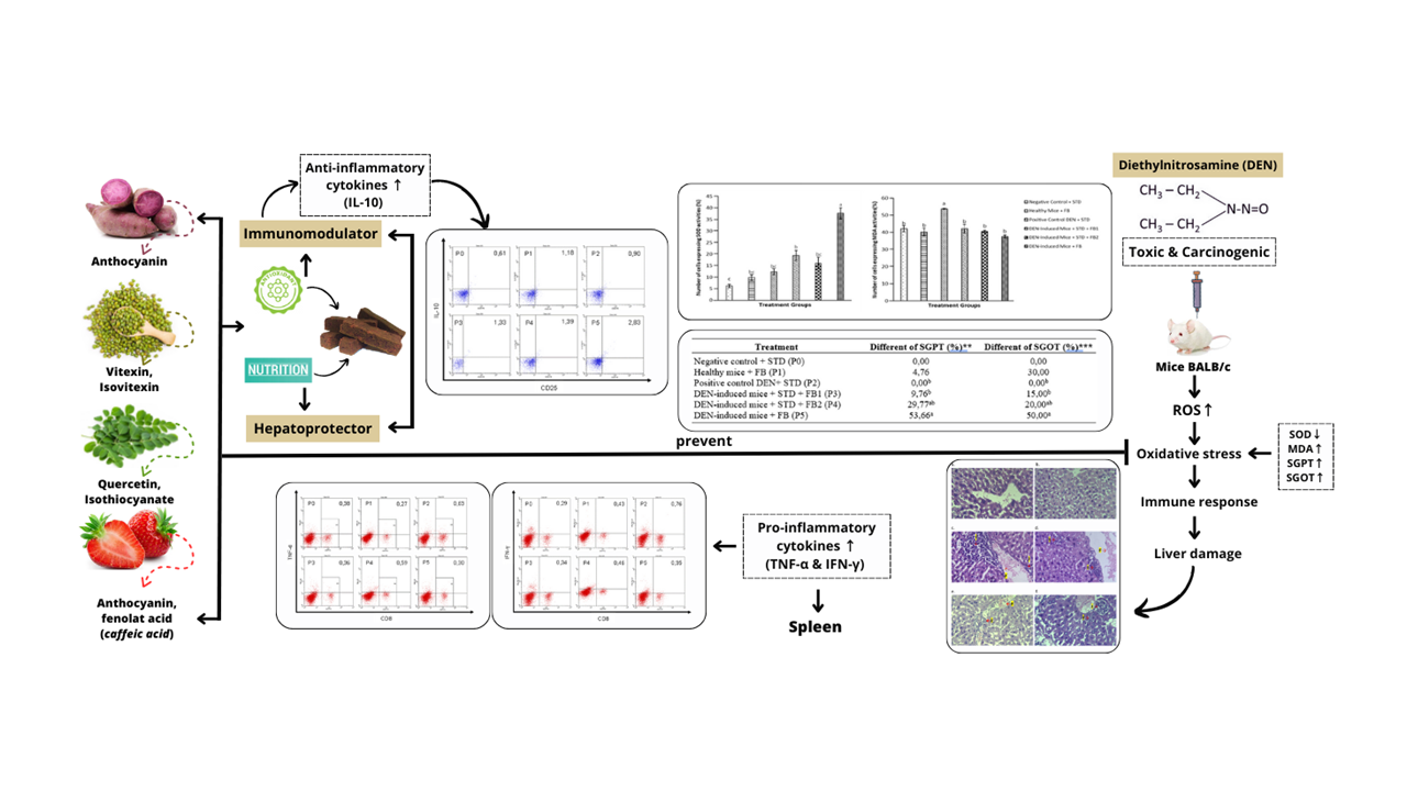 The food bar’s effect as an immunomodulator and hepatoprotector in vivo was tested on male BALB/c mice induced with diethylnitrosamine (DEN). The experimental animals were treated using the Post-test Control Group Design method. Six groups of 30 mice each made up the sample: The negative control group of healthy mice fed with a normal diet (P0); the group of healthy mice given the food bar (P1); the positive control group of mice induced with DEN and given a normal diet (P2); the group of mice induced with DEN and given a normal diet + food bar at 11,700 mg/kg (P3); the group of mice induced with DEN and given a normal diet + food bar at 23,400 mg/kg (P4); and the group of mice induced with DEN given the food bar (P5). The observations conducted included the spleen, which was used for the analysis of immunomodulators on T CD4+CD25+, CD4+, and CD8+ cells with cytokines TNF-α, IFN-Ɣ, and IL-10, blood serum for the analysis of SGPT and SGOT, and liver organ for the analysis of SOD, MDA, and histopathology. The results of the immunomodulator testing showed that the administration of the food bar (P5) significantly (p < 0.05) resulted in the highest percentage of CD4+ T cells at 2.93 % and CD8+ T cells at 5.30 %, a lower percentage of CD8+ T cells expressing proinflammatory cytokines (TNF-α at 0.27 % and IFN-γ at 0.29 %), a higher percentage of CD4+ T cells expressing CD25+, and CD25+ T cells expressing anti-inflammatory cytokines (IL-10) at 2.83 %. This group also exhibited the lowest levels of SGPT and SGOT, a higher percentage of SOD, and a lower percentage of MDA compared to other groups. The food bar, based on the mix of purple sweet potato, mung beans, moringa leaves, and strawberries, also reduced liver damage, as demonstrated through histopathological testing.