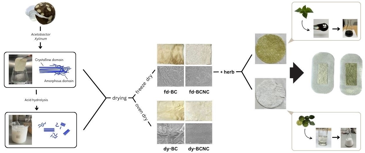 Wound dressings play an essential role in wound care and healing, but the price is expensive for patients who have to treat for a long time such as patients from burns, scalds, etc. The objective of the research is to develop a wound dressing made with bacterial cellulose and local herb that has antibacterial properties, is cheap, and can be created by yourself. The bacterial cellulose (BC) produced from Acetobactor xylinum using coconut water waste to reduce costs. Its structure was changed to bacterial cellulose nanocrystals (BCNC) by acid hydrolysis, dried in 2 methods: Oven dried at 50 °C (dy) or freeze dried (fd). Then, herbal dressings were produced as a composite BC with herbs in 2 forms: A solution, i.e. C. Odorata leaf extract solution and a colloid, i.e. C. hystrix essential oil nanocapsule. The results for the production of a wound dressing showed that fd-BCNC had good quality, good fiber dispersion, high porosity and no antibacterial activity. It is suitable as a primary or secondary wound dressing, that does not help in wound healing. When fd-BCNC was loaded with herbs in 2 forms, it was found to be stable at room temperature, water adsorption, water vapor permeability and inhibit Staphylococcus aureus and Escherichia coli. Especially fd-BCNC of nanocapsule of C. hystrix peel essential oil has the best antibacterial effect. Therefore, you can apply this developed wound dressing to herbs used specifically for healing wounds. Moreover, we believe that this research will be a database that can be expanded to commercial production.