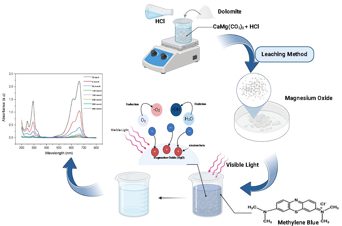 Dolomite is a type of sedimentary rock material that is often found in the Bangkalan Madura area. This dolomite has a higher MgO compound content than in the other areas, namely 40 %, but its utilization has only been as fertilizer and building materials. For this reason, this research aims to determine the characteristics of MgO nanoparticles and their application in photocatalytic with visible light irradiation. The synthesis of MgO nanoparticles used the hydrochloric acid leaching method, and the results were characterized by X-ray diffraction, Fourier transform infrared, Scanning electron microscopy, Transmission electron microscopy, Raman spectroscopy, Photoluminescence, and Ultraviolet-visible spectroscopy. The results showed that the synthesized MgO nanoparticles had a periclase phase and were shaped like a spherical cube with an average nanoparticle size of 27 nm and an energy gap of 3.9 eV. The optical properties of the MgO nanoparticles showed quite strong luminescence at a Raman shift of 1,087.36 cm−1, which was associated with the type of vibrational waves in the atomic lattice, and there were surface defects on the surface of the MgO nanoparticles, namely in the emission spectra of 720.06 and 740.39 nm originating from oxygen vacancies (F-center) and Mg vacancies (V-center). The photocatalytic activity of MgO nanoparticles in visible light showed the optimum time to degrade 30 ppm methylene blue dye in 360 min and yielded a degradation percentage of 99 %. Therefore, MgO nanoparticles could be used for processing industrial dye waste using visible light.