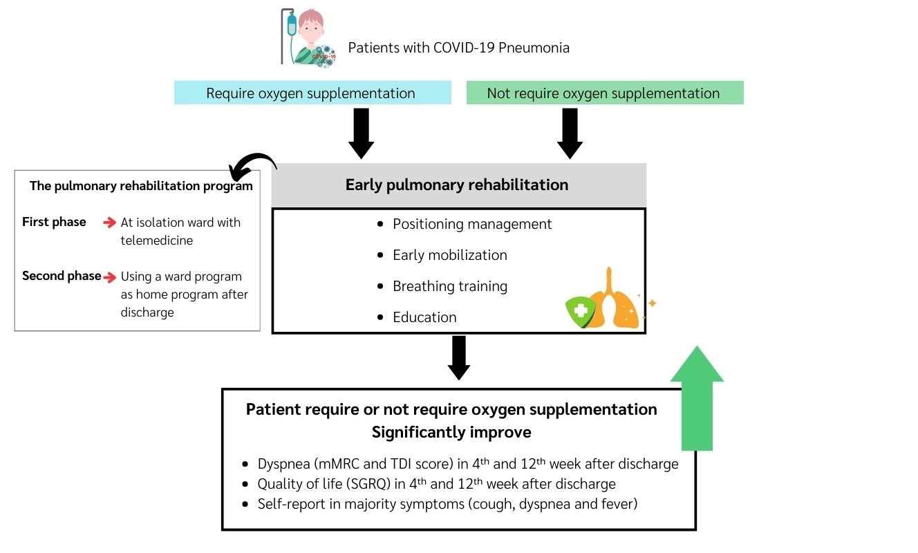 - Early pulmonary rehabilitation, from inpatient to a 12-week outpatient program for moderate and severe cases, is safe and improves dyspnea, quality of life, and patient reported symptoms.