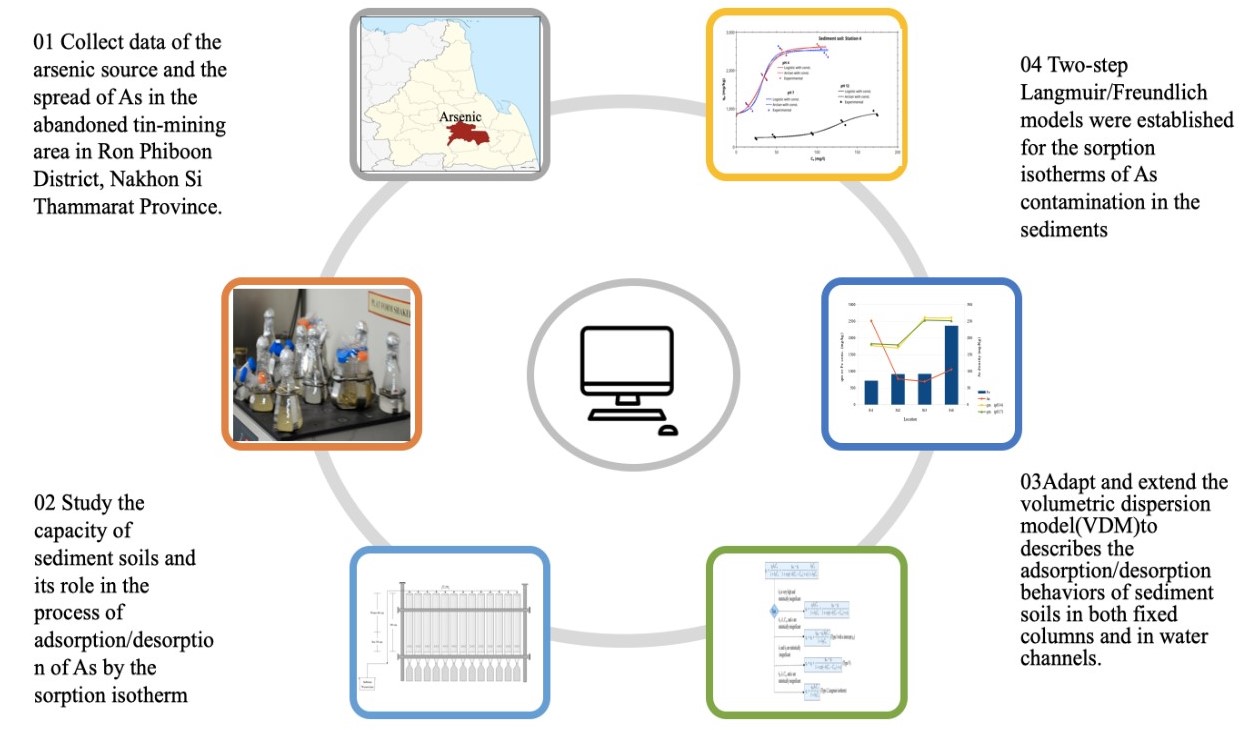 Although tin mining activities in the southern part of Thailand have been abandoned for more than 40 years, arsenic contamination in old tin-mining areas continues to pose a health risk. Fortunately, natural adsorption of arsenic by sediment has reduced the arsenic concentration in water to the maximum allowable level within a 10-kilometre radius of the mine sources. This article attempts to characterize the arsenic adsorption properties of sediment along a water creek which passes through the old tin-mine areas in Ron Phibun district, Nakhon Si Thammarat province, Thailand, where the contamination has been most severe. It was found that Fe tends to be associated with the adsorption capacity of arsenic in sediment. However, pH 4 and pH 7 did not associate with adsorption capacity. At pH 12, the solubility of arsenic increases, making it less likely to be adsorbed into the sediment and more likely to dissolve in water. For the adsorption isotherms of the sediment, the so-called ‘2-step Langmuir/Freundlich models’, with the advance of switching functions (Logistic or Arctan functions), were proposed. Then, based on the principle of parsimony, a stepwise model reduction approach was used to choose the optimal models. It was found that the isotherms were used successfully to describe the historical arsenic-contamination data of the past 14 years (2005 - 2019) and to predict future trends qualitatively.