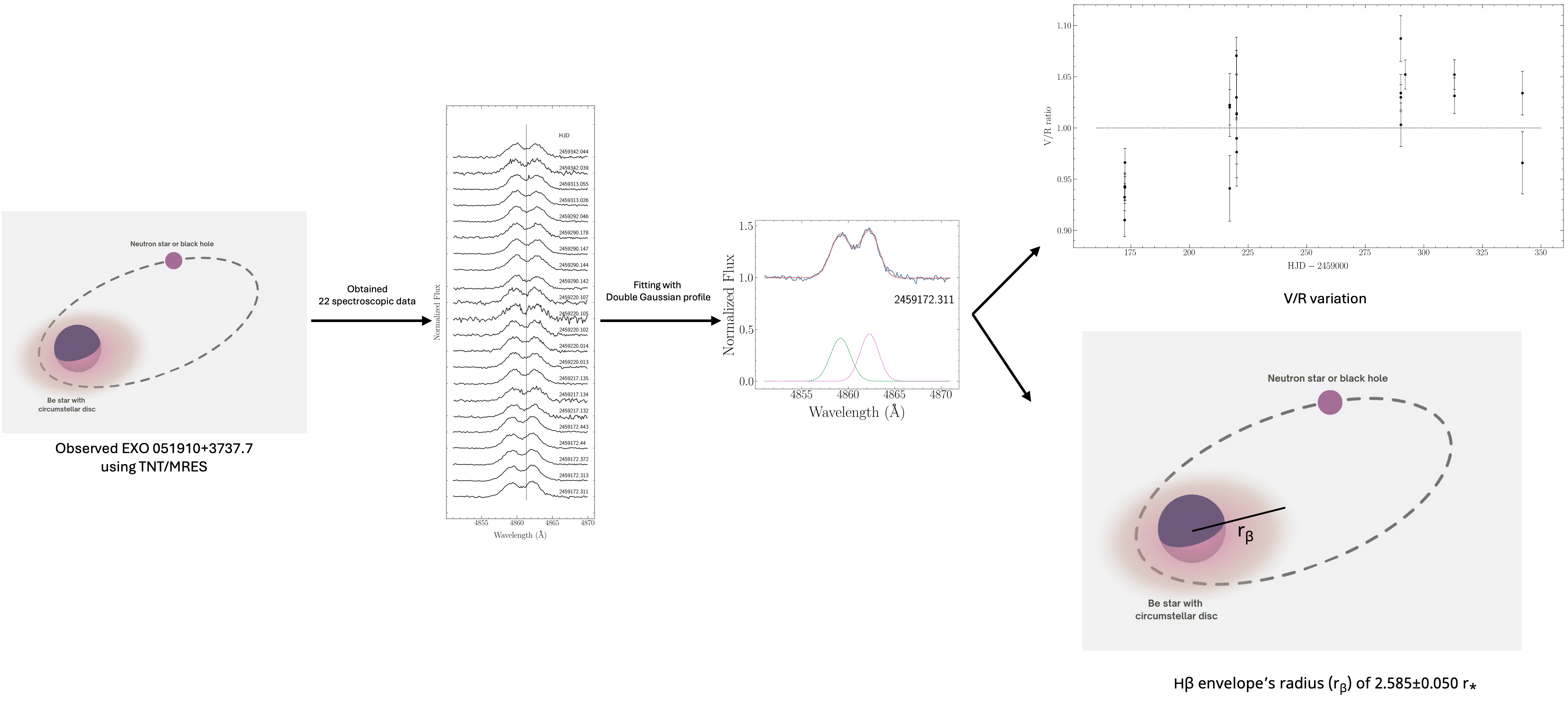 - EXO 051010+3737.7 spectral line profiles were observed using the TNO/MRES instrument, revealing absorption lines for He I, and double-peak emission lines for Hand H.