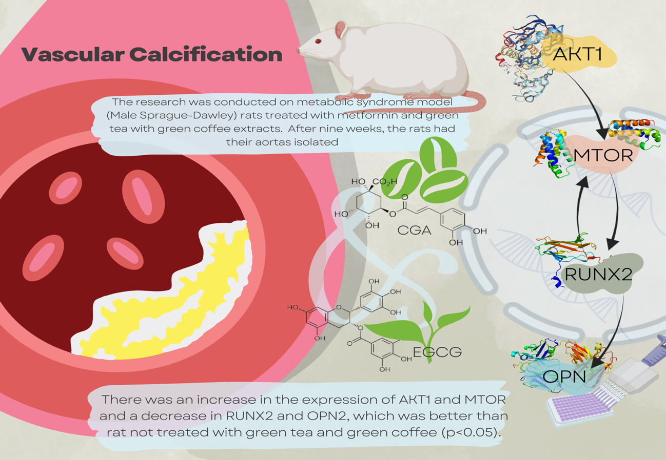 - In conclusion, this study showed the potential for therapeutic use of green tea and green coffee extracts to prevent vascular calcification in rat models of metabolic syndrome by increasing AKT1 expression, decreasing MTOR and RUNX2, with the main implication of reducing the circular protein product, osteopontin.
