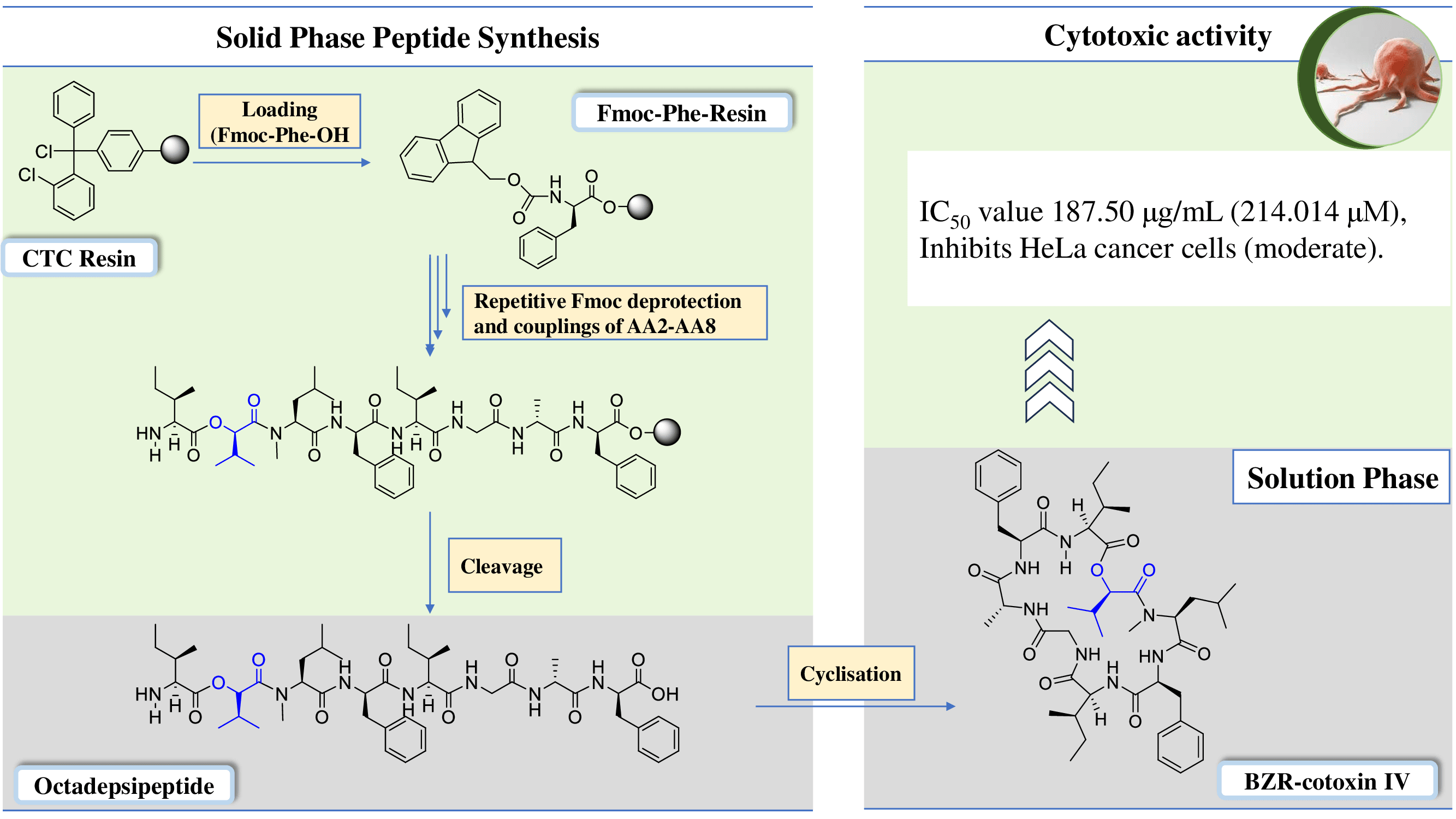 Anticancer peptides (ACPs) is a potential alternative for future cancer therapy. ACPs specifically inhibit cancer cells through a non-enzymatic membranolysis mechanism. One potential anticancer peptide worthy of investigation is BZR-cotoxin IV. Currently, research on BZR-cotoxin IV is limited to isolation, making it an interesting area for further development. One approach to developing BZR-cotoxin IV is through chemical synthesis techniques. This compound belongs to the group of cyclodepsipeptides that are naturally produced by the fungus Bipolaris zeicola Race 3. The synthesis of BZR cotoxin IV involves 3 steps: (1) Synthesis of the hydroxy acid precursor by conversion of L-valine amino acid to (2R)-hydroxyisovaleric acid, (2) synthesis of the linear depsipeptide using solid-phase peptide synthesis on 2-chlorotrityl chloride resin and (3) cyclization of the linear depsipeptide using solution phase synthesis to produce the BZR cotoxin IV compound with a purity of 11.7 %. BZR-cotoxin IV was characterized using HR-TOF-MS and 1H and 13C-NMR to validate the desired product. Anticancer activity testing was performed using the Resazurin assay on the HeLa cancer cell line, resulting in an IC50 of 187.50 μg/mL (214.014 μM) categorized as moderate.