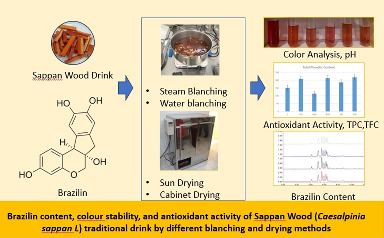 Caesalpinia sappan L (CS) heartwood is used as a natural red colorant in several Asian ethnic traditional drinks both as sole ingredient or mixed with other herbs. However, the pigment is unstable and easily degraded during storage which affects consumer acceptance. This research aimed to investigate the effect of different blanching and drying methods on the color stability, brazilin content, and antioxidant activity of CS heartwood drinks. Steam blanching, water blanching, sun drying and cabinet drying were examined in this study. The most common method applied in traditional production, without blanching and sun drying, was used as a control. The experimental design used was complete randomized design with triplicates. Data are presented as mean ± standard deviation and analyzed by SPSS statistics version 20.