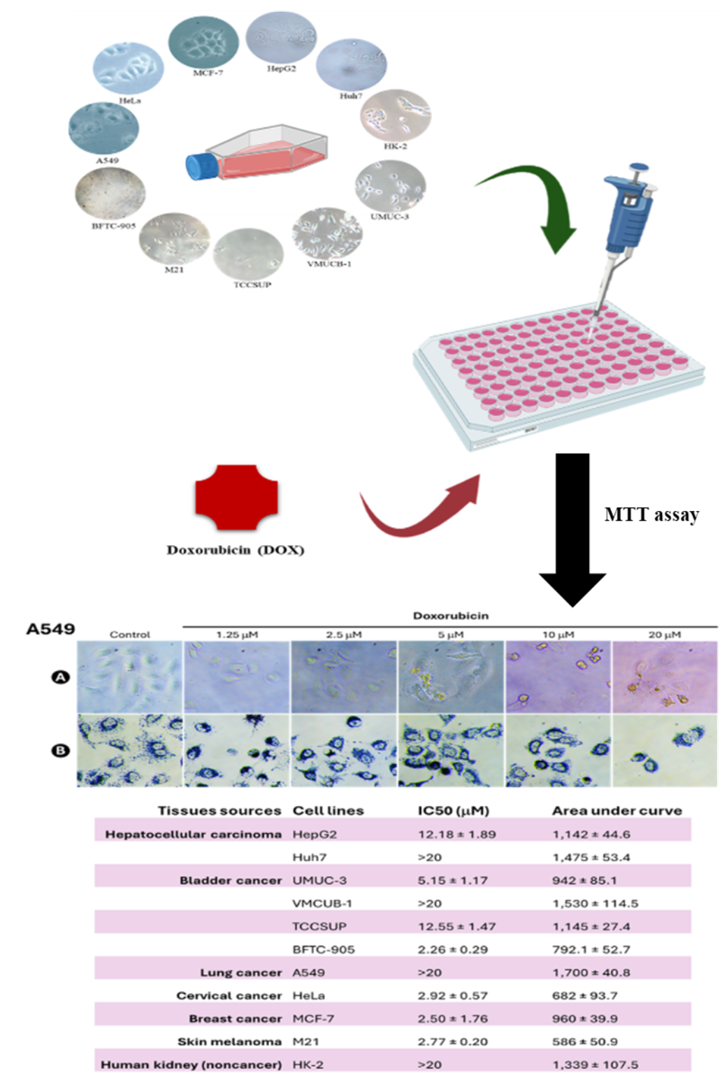 - Huh7, VMCUB-1, A549 and HK-2 cells were resistant to doxorubicin.