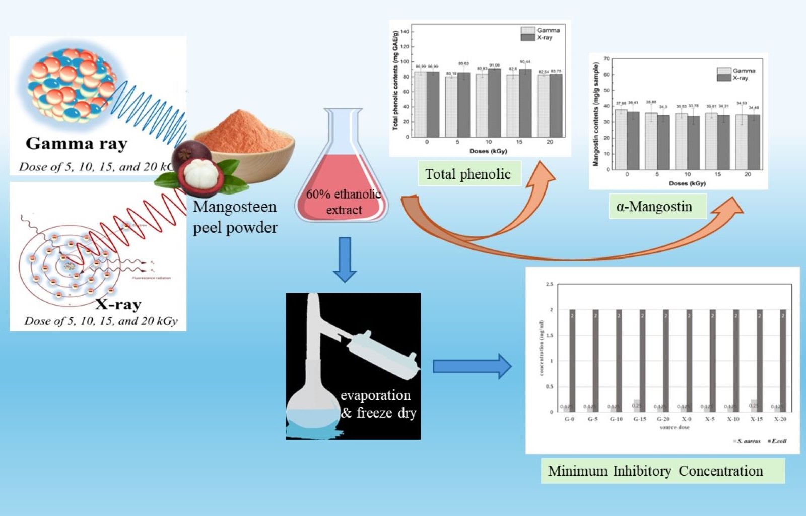 - There were no significant changes in antioxidant activities (DPPH, FRAP), a-mangostin contents, total phenolic contents (TPC) and antibacterial activities: after irradiation up to 20 kGy