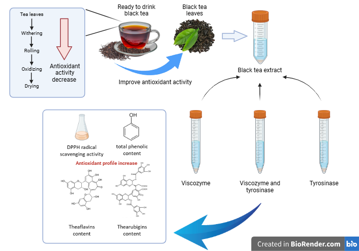 The problem with ready-to-drink (RTD) black tea is a long manufacturing process and contains phenolic compounds and low antioxidant activity due to the enzymatic oxidation process. Viscozyme is an enzyme that degrades plant cell walls during extraction so that it releases active components from the cell wall, such as phenolic contents and antioxidant activity. Meanwhile, tyrosinase includes the polyphenol oxidase enzyme, which can take advantage of catechins conversion into theaflavins and thearubigins. This study aimed to determine the addition of viscozyme and tyrosinase combination to increase the content of phenolic compounds, antioxidant activity, and improve the appearance of black tea (color). The study used young leaves that had their enzymes inactivated was added with viscozyme to fresh tea leaves extract. The tea extract that had been given viscozyme was then added with tyrosinase, and the incubation was carried out. The addition of tyrosinase with higher concentrations (3,571 U/mL) and longer incubation times (40 min) decreased total phenolic contents, antioxidant activity using DPPH free radical scavenging method, increased tea cream formation (precipitation that forms as the tea cools), the compound of theaflavins, thearubigins, and TF:TR ratio (comparison of theaflavins and thearubigins contents) in tea extracts that had been treated with viscozyme. The combination of viscozyme and tyrosinase gave higher total phenolic compounds, antioxidant activity, theaflavins, thearubigins content, and TF:TR ratio compared to control and could prevent the formation of tea cream. The use of viscozyme 250 µL and tyrosinase 3,571 U/mL for 20 min on ready-to-drink black tea gave the best effects in this study.