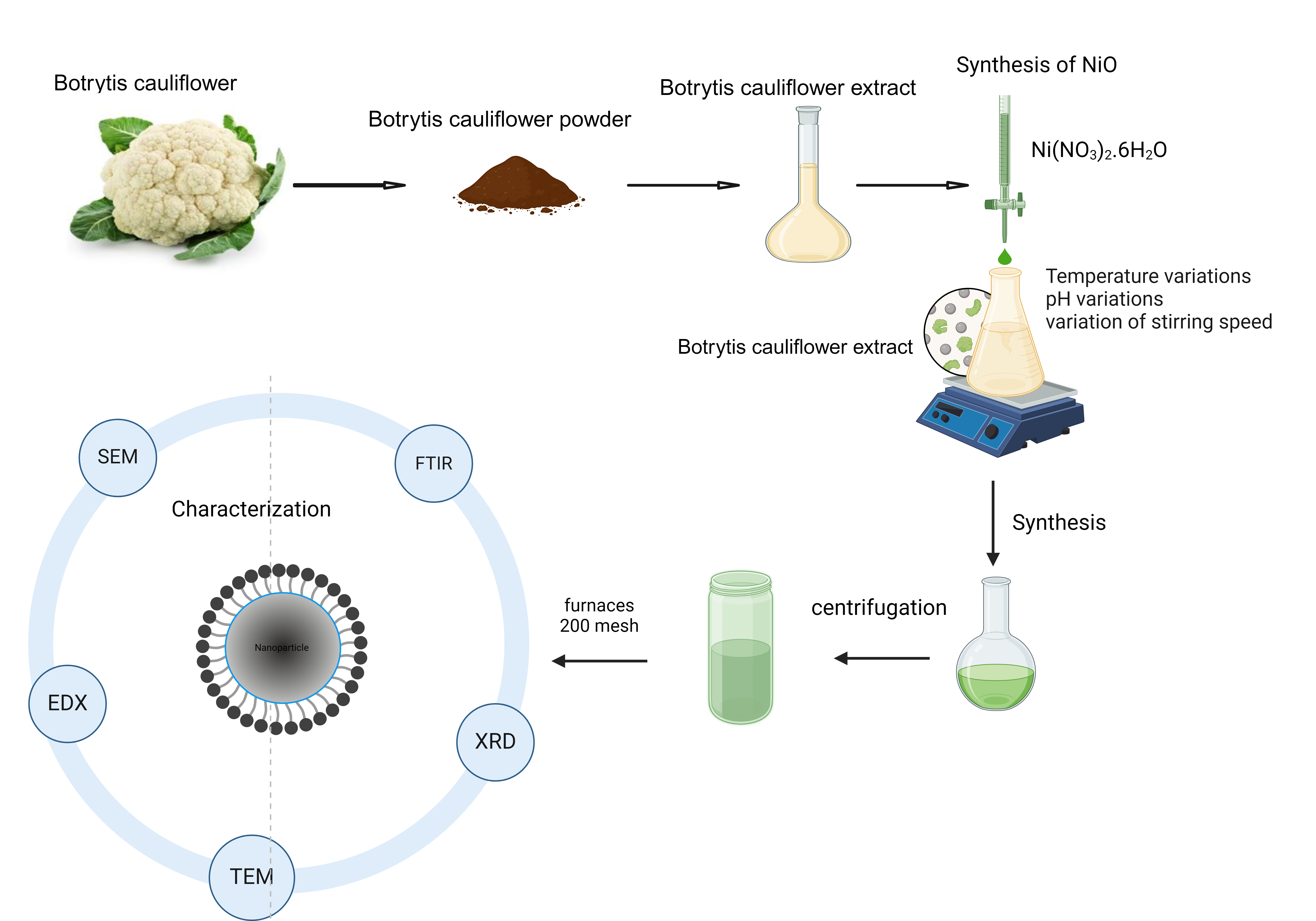 - Developed an eco-friendly synthesis route for NiO nanomaterials using white broccoli (Brotrytis cauliflower) flower extract.