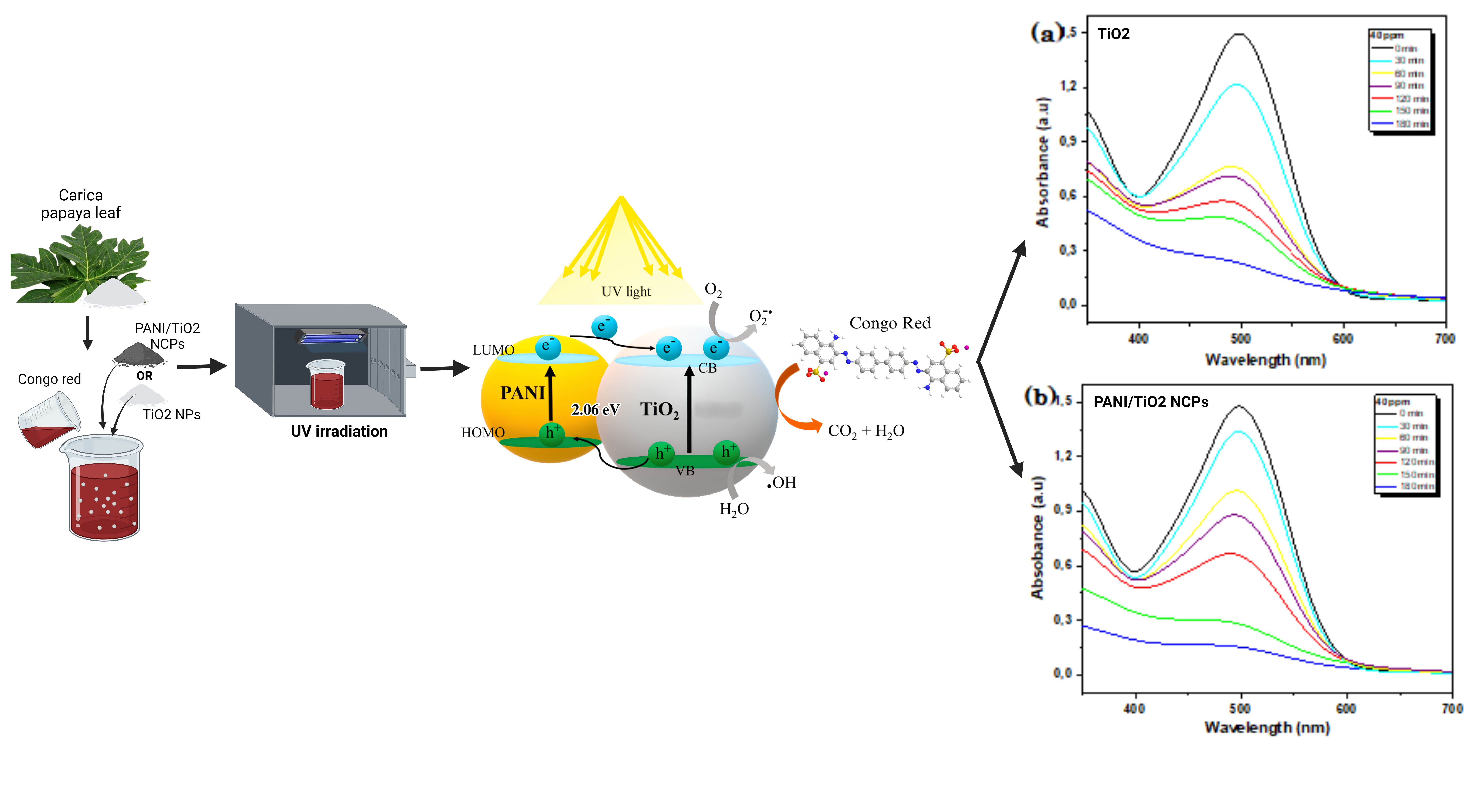 This study uses the green synthesis method to investigate the photocatalytic properties of TiO2 nanoparticles (NPs) and PANI/TiO2 nanocomposites (NCs). The in-situ polymerization method used the papaya leaf extract as a reducing agent. TiO2 NPs have a particle size of 56 nm and a band gap of 2.46 eV, while PANI/TiO2 NCs have a particle size of 44 nm and a band gap of 2.06 eV. The performance of TiO2 NPs and PANI/TiO2 NCs as semiconductor-based photocatalysis was evaluated using Congo red dye degradation. The results showed that PANI/TiO2 NCs have better photocatalytic performance with a Congo red dye degradation rate of 97.12 %, higher than TiO2 nanoparticles (95.52 %). This enhanced performance can contribute to the synergistic effect between the TiO2 and PANI, leading to improved charge separation and reduced recombination.
