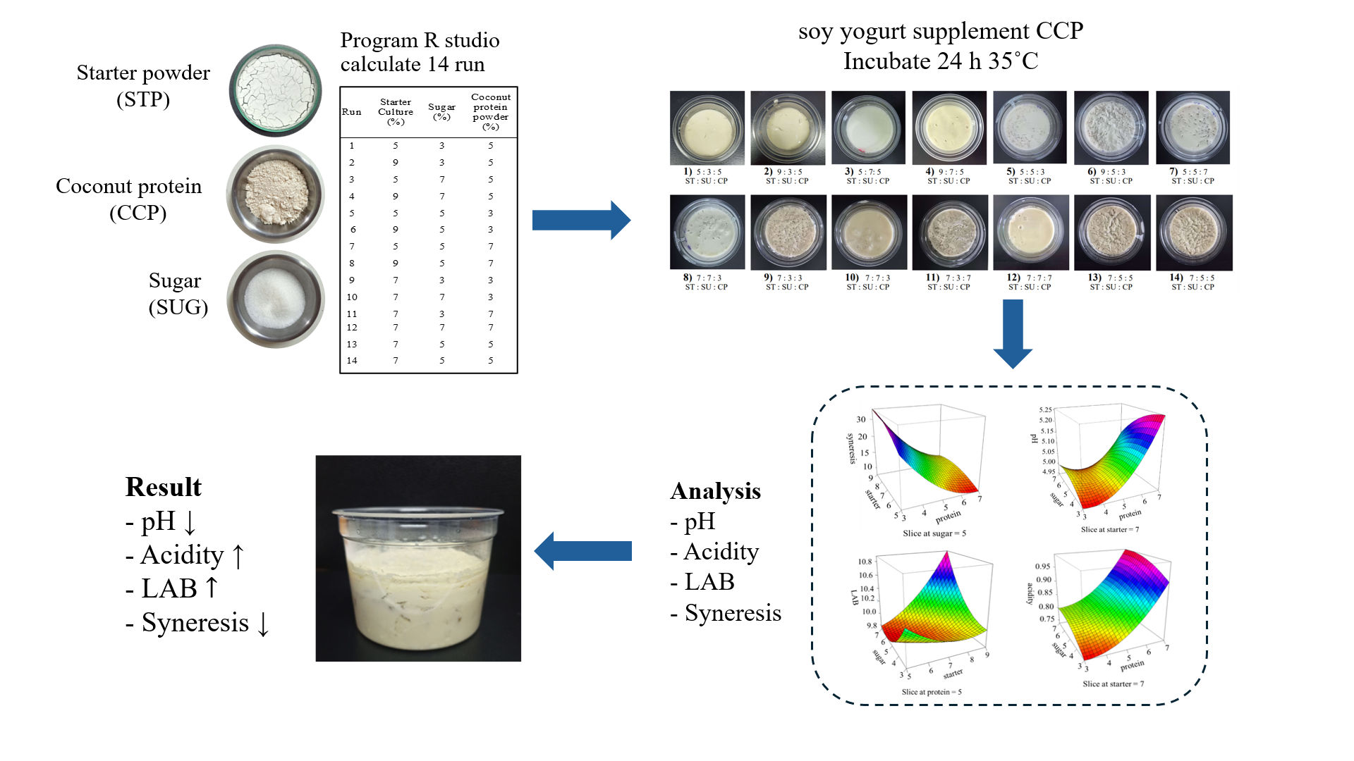 Currently, there is an increasing demand for milk alternatives due to allergies to milk protein and lactose intolerance. Other milk alternatives such as soy milk, oat milk and corn milk, necessitating the development of plant-based yogurt. Additionally, plant-based protein substitutes have been used to improve the texture of yogurt. This research work aimed to optimize the levels of coconut protein concentration (CCP), Lactobacillus plantarum TISTR 2084 starter powder (STP) and sugar concentration (SUG) through incubation at 35 °C for 24 h, resulting in improved product characteristics. A response surface methodology (RSM) was used to determine the optimization of soy yogurt with the combined effects of STP (5 - 9 % w/v), SUG (3 - 7 % w/v), and CCP (3 - 7 % w/v). There were evaluated in terms of some quality criteria of plant-based yogurt namely: pH, titratable acidity (TA), lactic acid bacteria (LAB), and syneresis. The results revealed that soymilk yogurt exhibited average bio-physical-chemical properties. The experimental variables significantly affected TA and syneresis. The models of research were high value of R2 for TA (0.9859) and syneresis (0.9760) which demonstrate the adequacy of RSM. When raising the CCP to an increase TA, decrease syneresis relative to other samples. It was possible to obtain high-quality yogurt. This product is in high demand for increasing protein level of regular yogurts. Soymilk yogurt products with 5 % CCP showed in higher LAB (11 log CFU/mL) and decreased syneresis, while 7 % CCP resulted in lower LAB (9 log CFU/mL) and increased syneresis. According to the optimal contents of 9 % STP, 7 % SUG and 5 % CCP were determined, with a desirability of 86.3 %. These STP and CCP findings provide critical information for future research into innovative plant-based yogurt substitutes.