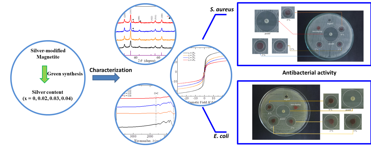 The rising resistance of bacteria to traditional antibiotics has prompted the investigation of alternative antibacterial agents, including nanoparticles. Among these, silver-modified magnetite nanoparticles have attracted significant attention due to their unique properties and potential biomedical applications. In this study, silver (Ag) modified magnetite was synthesized to determine its antibacterial activity. Ag-modified magnetite nanoparticles with variation (x = 0, 0.02, 0.03 and 0.04) has been succesfully synthesied using the sol-gel method. X-ray diffractometer (XRD) results show that all peaks correspond to ICDD no 01-1111 owing face center cubic (fcc) with space groups Fd-3m. Calculation of crystallite size D using Schere’s equation at the strongest peak shows an increase in the D with increasing x concentration from 23.22 to 35.28 nm. FTIR analysis indicates absorption peaks at 465 and 570 cm−1 which is typical original of magnetite absortion. Vibrating sample magnetometer, VSM result show that the magnetic saturation decrease with the increase of the x, i.e. 14.12 emu/g for x = 0 to 8.17 emu/g for x = 0.04. Finally, Ag-substituted magnetite nanoparticles show potential as antibacterial agents against Eschericia coli and Staphylococcus aureus, evidenced by the appearance of inhibition zones.