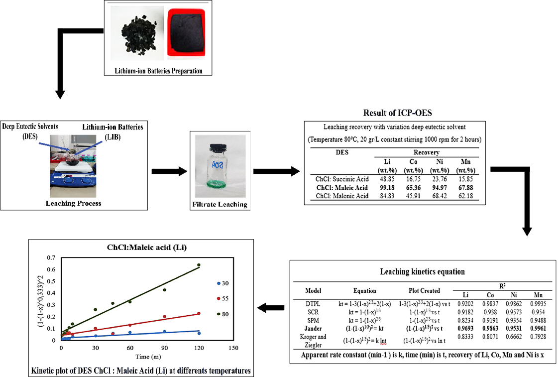 To meet the high demand for lithium-ion batteries (LIBs) and their corresponding challenges, effective and sustainable recycling methods are necessary. This research explores the use of deep eutectic solvents (DES) based on polycarboxylic acid to recover critical metals, such as lithium (Li), cobalt (Co), nickel (Ni), and manganese (Mn) from spent LIBs. The leaching efficiency of 3 DES was evaluated under various conditions by synthesizing them with succinic acid, malonic acid, and maleic acid using choline chloride. Optimal recovery was achieved with ChCl: Maleic acid, yielding 99.18 wt. % Li, 65.36 wt. % Co, 94.97 wt. % Ni, and 67.88 wt. % Mn at a S/L ratio of 20 g/L at 80 °C with constant stirring. Higher S/L ratios led to reduced recovery rates due to mass transfer limitations and solution saturation. Kinetic modeling revealed that the Jander model best described the leaching mechanism, suggesting a diffusion-controlled process. The activation energy calculation on DES ChCl: Maleic acid produces Li 38.57 kJ/mol, Co 63.09 kJ/mol, Ni 64.87 kJ/mol, and Mn 52.64 kJ/mol. The use of DES derived from eco-friendly polycarboxylic acids (succinic, malonic, and maleic acids) in this study represents an innovative way to recover critical metals from spent lithium-ion batteries (LIBs) in a sustainable and effective manner. Future studies are advised to examine the DES composition and investigate how agitation influences the recovery of specific metals.