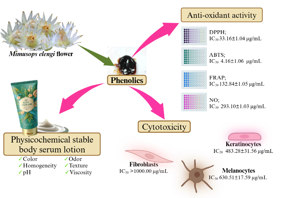 Natural phenolic antioxidants have gained increasing attention for their safety and effectiveness in cosmeceutical products. Among these, the flowers of Mimusops elengi (M. elengi), traditionally used in Thai medicine, are known for their rich content of phenolic and terpene compounds, which contribute to their therapeutic potential. This study investigates the antioxidant activity and skin safety of M. elengi flower hydroethanolic extract (MEFE) for cosmeceutical applications. The MEFE was prepared through maceration, and the total phenolic content was measured using the Folin-Ciocalteu method. FT-IR and UV-VIS absorption spectroscopy were employed to confirm the presence of phenolic functional groups. Antioxidant activities were tested using DPPH, FRAP, ABTS, and NO assays to assess the MEFE’s radical scavenging efficiency. In addition, cytotoxicity assays on human skin cells, including keratinocytes (HaCaT), fibroblasts, and melanocytes (B16F1), were conducted to ensure safety. A body serum lotion containing the 2.00 % w/w MEFE was formulated and evaluated for stability. Results showed that the extract contained phenolics 77.02 ± 0.01 mg GAE/g and exhibited strong antioxidant activities with IC50 values of 33.16 ± 1.04, 4.16 ± 1.06, 132.84 ± 1.05, and 293.10 ± 1.03 µg/mL for DPPH, FRAP, ABTS, and NO assays, respectively. Cytotoxicity testing confirmed low toxicity, with IC50 values of 483.28 ± 31.56 µg/mL for keratinocytes, >1,000.00 µg/mL for fibroblasts, and 630.51 ± 17.59 µg/mL for melanocytes. The 2.00 % MEFE body serum lotion demonstrated good physical stability, suggesting that the MEFE is a promising ingredient for skincare products. Therefore, further studies are needed to identify the phytoconstituents in the MEFE, and explore the molecular mechanisms by which the MEFE inhibits skin aging from oxidative stress. Additionally, clinical trials are needed to evaluate its overall safety through a skin irritation test and to assess its efficacy in the 2.00 % MEFE body serum lotion.