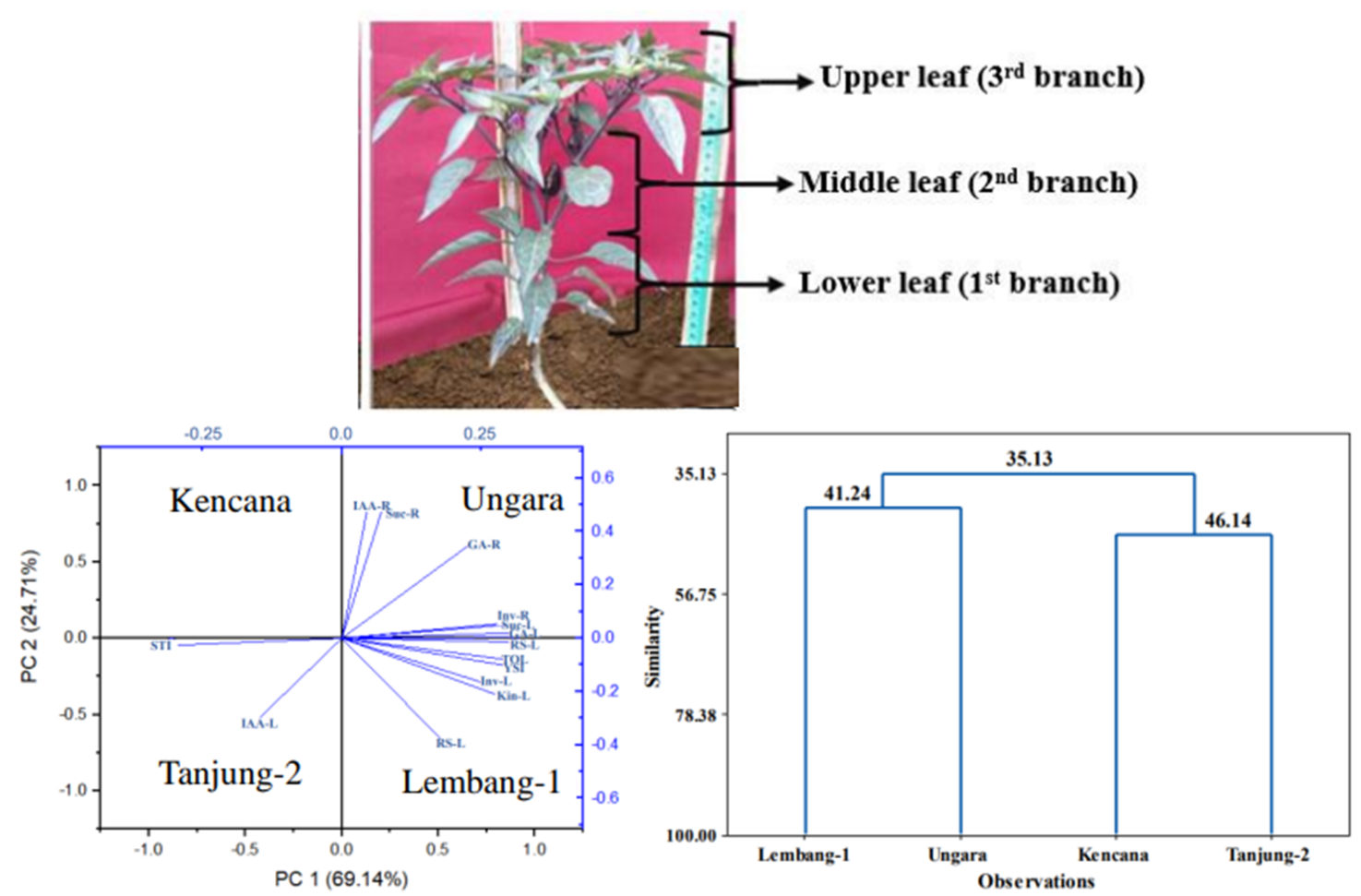 This research provides information on chili production improvement in lowland areas using root-shoot growth modification through root cutting and leaf defoliation. Response root-cutting chili yield based on stress selection indices, phytohormones, sucrose content, invertase activity, and reducing sugar under leaf defoliation was classified into tolerant (Lembang-1 and Ungara) and intolerant (Tanjung-2 and Kencana). The tolerant varieties (Lembang-1 and Ungara) could increase fresh weight of fruit by 29.30, 39.26 %, respectively under 60 and 40 % leaf defoliation compared to control (0 % leaf defoliation without root-cutting). The increased chili yield and root-shoot growth were due to physiological activity. Root growth was driven by increased invertase activity, reducing sugar, indole acetic acid, and kinetin hormones, while shoot growth was influenced by increased sucrose, invertase activity, reducing sugar, gibberellin, and kinetin hormones. Therefore, leaf defoliation technique can be used to optimize root-cutting chili production in lowland areas through improving physiological activity in root and shoot.