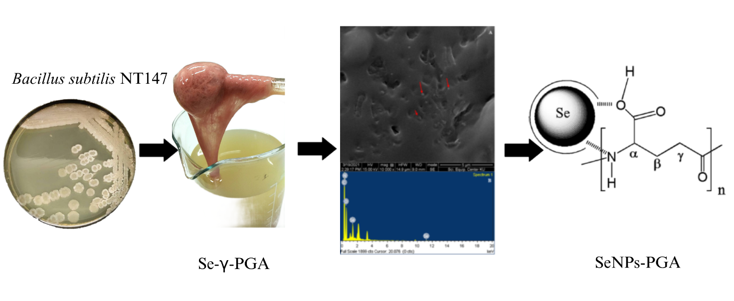 Biogenic synthesized selenium nanoparticles (SeNPs) have garnered significant interest in both biomedical and agricultural fields. Encapsulation of SeNPs by natural biopolymers can increase the stability and biocompatibility of the nanoparticles. In this work, synthesis of SeNPs by Bacillus subtilis NT147, g-polyglutamic acid (g-PGA) producing strain and production of Se-enriched g-PGA (Se-PGA) were carried out. B. subtilis NT147 was cultured in Luria Bertani broth supplemented with 0.5 mM Na2SeO3 at 37 ± 2 °C with shaking at 150 rpm. From ICP analysis, the selenium amount in the bacterial cells was highest at 18 h (11.3 mg/g cell DW). The TEM image confirmed that SeNPs were spherical shape and produced mainly in the bacterial cells. Particle size analysis using a laser scattering particle size distribution analyzer indicated that small particle sizes 226 and 259 nm were observed at 6 and 12 h, respectively. Poor dispersion and aggregation of SeNPs were observed after 12 h, resulting in larger particles. Production of g-PGA significantly decreased when Na2SeO3 was presented in the culture media. Therefore, B. subtilis NT147 was cultured in a sucrose yeast extract medium containing 5 % sucrose at 37 ± 2 °C with shaking at 150 rpm for 36 h to maximized g-PGA yield. Then 2.5 mM Na2SeO3 was added into the culture medium and continued shaking for 4 h. Cells were removed and Se-PGA was precipitated. SEM image showed a spherical shape of SeNPs dispersed in g-PGA and the EDS confirmed the presence of Se, C, N and O in the Se-PGA composite suggesting that SeNPs were mainly came out after cell lysis. FTIR spectra of Se-PGA showed peak, indicating the presence of carbonyl and hydroxyl groups, suggesting proteins and amino acids. The Se-PGA at a concentration of 2.0 g/L exhibited 17.96 % of inhibition against Colletotrichum sp.