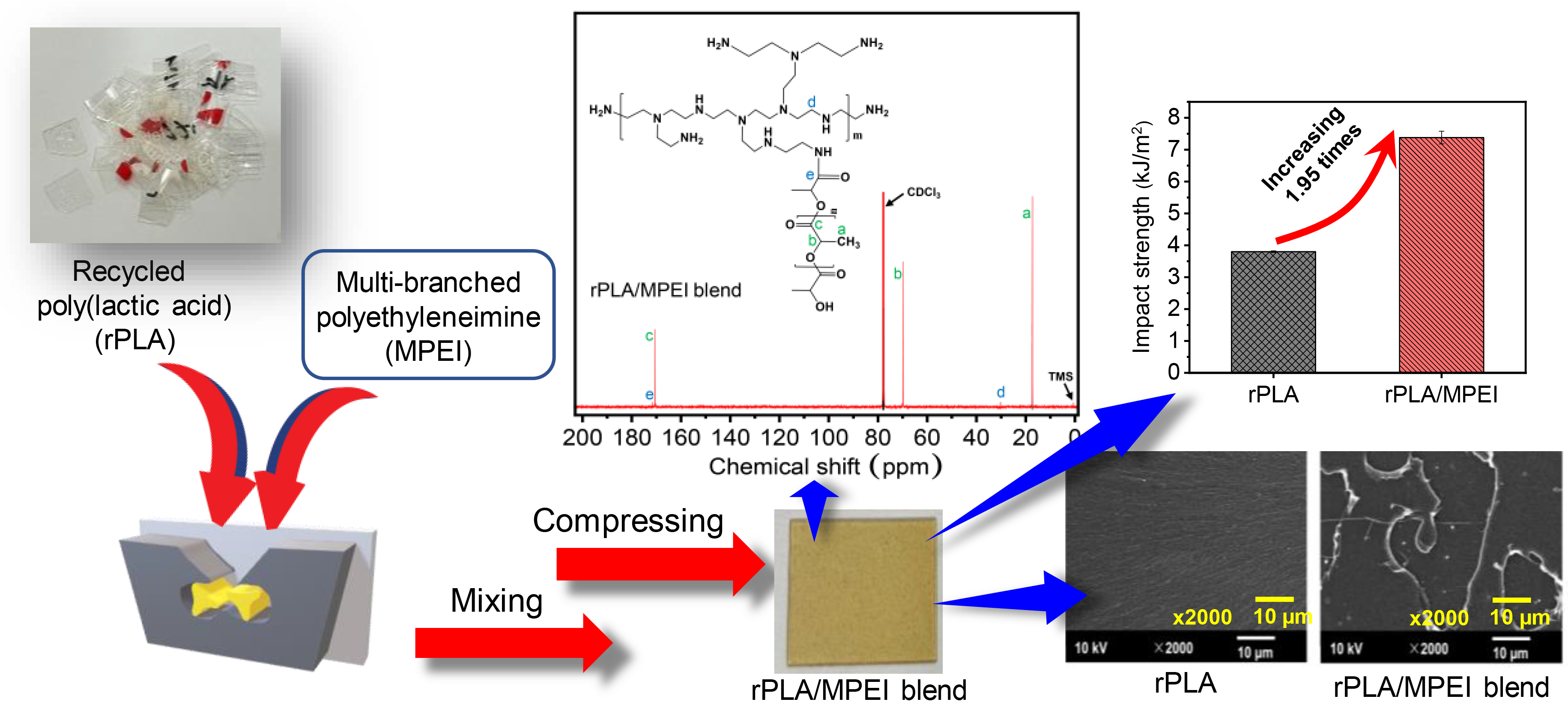 - The addition of MPEI significantly improved the mechanical strength and fracture resistance of recycled poly(lactic acid).