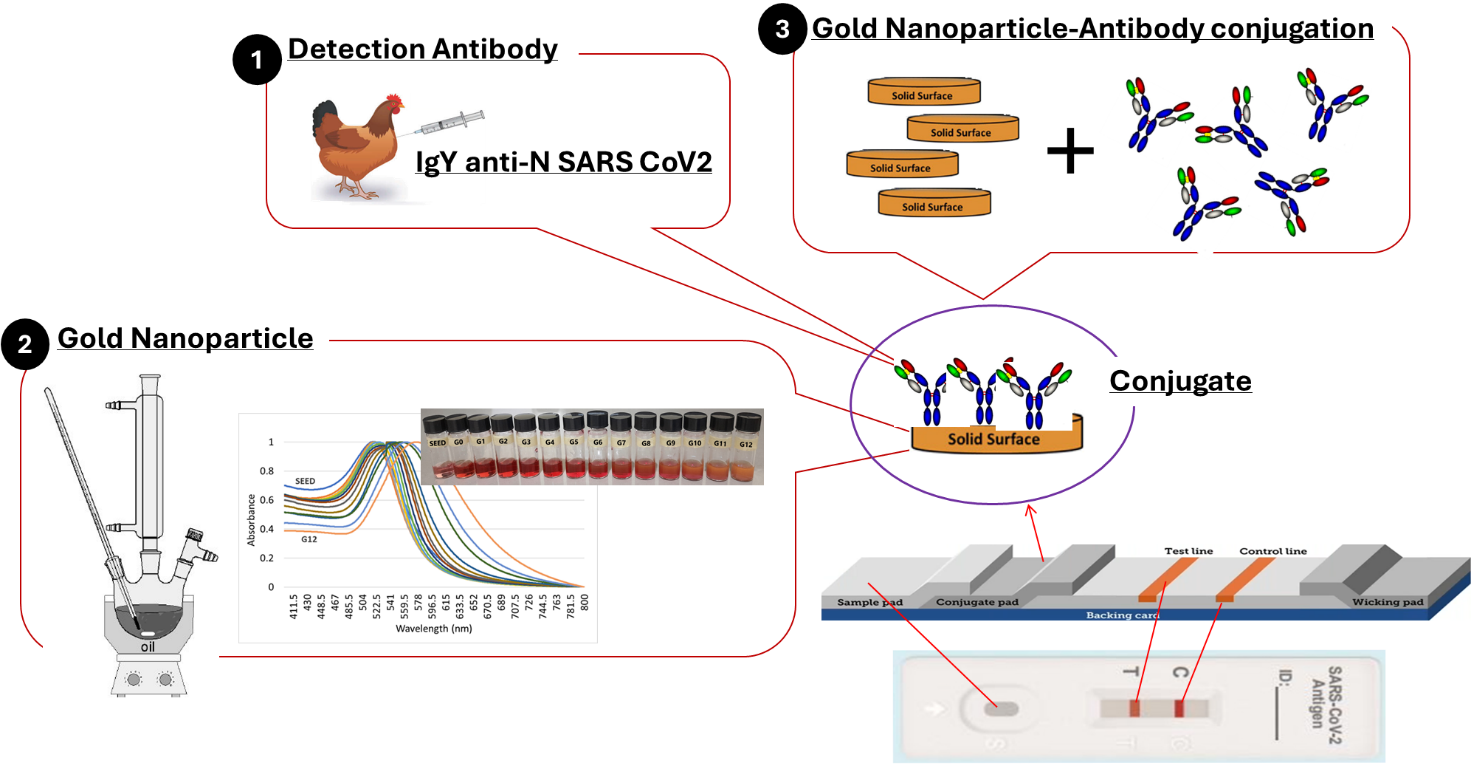 Although the number of COVID-19 cases is decreasing, the virus continues circulating, necessitating ongoing detection efforts. This is particularly important because COVID-19 symptoms like fever can resemble those of other tropical diseases like dengue fever. Lateral Flow Strip Biosensors (LFSB) offer a rapid and cost-effective testing method to address this issue. A crucial factor influencing the sensitivity and specificity of LFSB is the conjugate, which consists of a detection antibody and a visualization agent. Anti-N-SARS-CoV-2 IgY can be utilized as the detection antibody. This antibody was produced by immunizing chickens with a stable antigen derived from the SARS-CoV-2 virus, specifically the SARS-CoV-2 nucleocapsid protein (N-SARS-CoV-2). Gold nanoparticles serve as the visualization agent, enabling visual readings of the LFSB without additional equipment. The size of the gold nanoparticles affects their surface area and the resulting color, affecting the sensitivity of the LFSB. While various sizes of gold nanoparticles are available commercially, they tend to be quite costly, affecting the production expenses of the LFSB. Therefore, this study aims to develop LFSB conjugates for SARS-CoV-2 detection by synthesizing gold nanoparticles of different sizes and conjugating them with IgY anti-N-SARS-CoV-2. The gold nanoparticles were synthesized using the Turkevich-Seed Growth method, which allows for variations in size within a single synthesis process and uses non-toxic materials. The synthesized gold nanoparticles were characterized using a spectrophotometer, and their sizes were analyzed with a particle size analyzer. Subsequently, they were conjugated with anti-N-SARS-CoV-2 IgY via a passive conjugation method. The conjugates were characterized based on maximum wavelength shifts, and their aggregation parameters and functionality were tested using a half-strip spot test. This research demonstrates that gold nanoparticles of 63.9 nm are the most suitable for conjugation with anti-N-SARS-CoV-2 IgY.