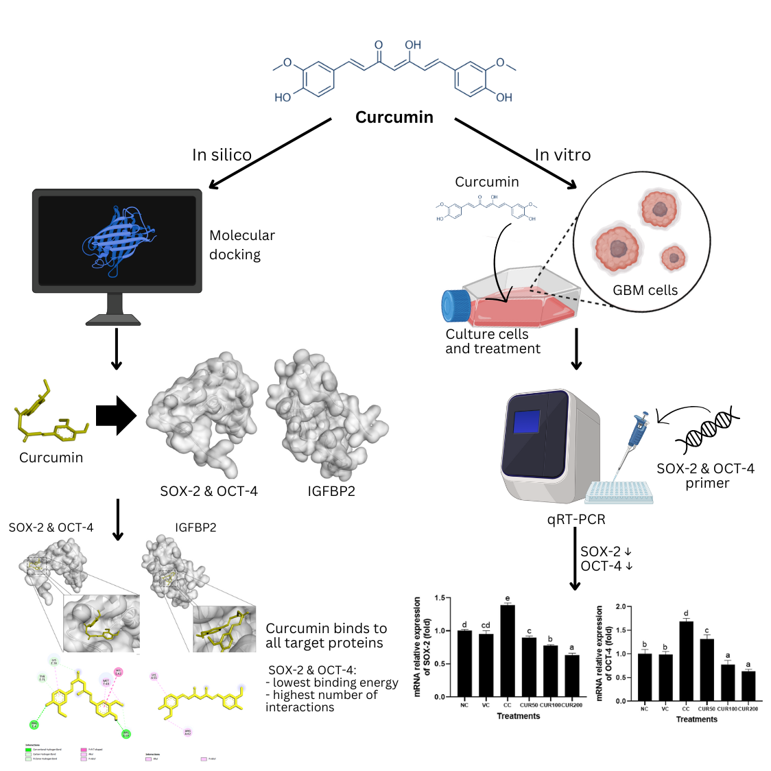 Glioblastoma is prevalent and aggressive primary malignant brain tumor in adults with an annual incidence rate approximately 0.59 to 5 cases per 100,000 individuals. Curcumin, a bioactive compound from Curcuma longa, holds promise as a potential antitumor agent for use in drug or functional food development. This study aimed to analyze the in silico and in vitro antitumor potency of curcumin. Molecular docking was conducted to assess curcumin’s interactions with tumor-related proteins SOX-2, OCT-4, and IGFBP2. In vitro experiments involved quantifying the SOX-2 and OCT-4 genes expression in glioblastoma (GBM) cells treated with curcumin using qRT-PCR method. Molecular docking revealed that curcumin binds effectively to all target proteins, with SOX-2 and OCT-4 exhibiting the lowest binding energy also the highest number of interactions, indicating stronger binding. In vitro analysis demonstrated that curcumin significantly downregulated the SOX-2 and OCT-4 expression in GBM cells, surpassing the effects of temozolomide, a standard cancer treatment. These findings highlight curcumin's potential as an antitumor agent by targeting cancer stem cell markers and pathways. This study provides foundational evidence for the future development of curcumin-based drugs or functional foods aimed at cancer therapy.