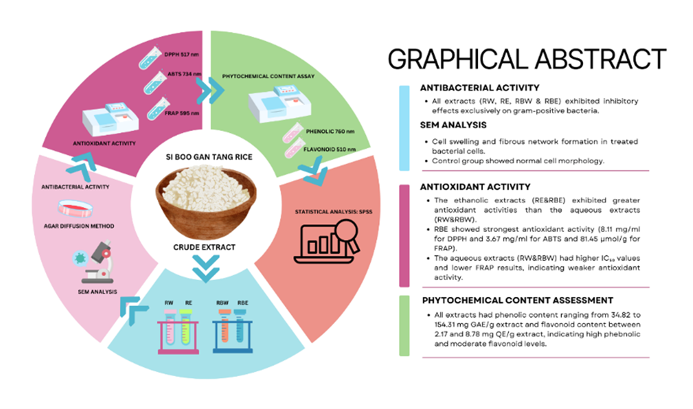 This study aimed to assess the biological properties of Si Boo Gan Tang Rice and bran extract. Antibacterial activity was evaluated using the agar well diffusion method, revealing inhibitory effects exclusively on gram-positive bacteria by both ethanolic Si Boo Gan Tang Rice (RE) and bran (RBE) extract. The inhibition zone of RE to methicillin-resistant Staphylococcus aureus (MRSA142), Staphylococcus aureus TISTR517, Bacillus cereus ATCC 11778, and Micrococcus luteus TISTR 884 was 2.07 ± 0.06, 1.94 ± 0.07, 1.95 ± 0.03, and 2.04 ± 0.03 cm, respectively. For RBE, the inhibition zones to methicillin-resistant S. aureus (MRSA142), Staphylococcus aureus TISTR517, B. cereus ATCC 11778, and M. luteus TISTR 884 were 2.07 ± 0.06, 2.00 ± 0.04, 1.67 ± 0.04, and 2.42 ± 0.56 cm, respectively. Scanning electron microscope (SEM) analysis indicated changes in the morphology of Staphylococcus aureus TISTR517 and Methicillin-resistant Staphylococcus aureus (MRSA142) cells treated with the RE and RBE, characterized by cell swelling and the formation of a fibrous network around them, contrasting with the control group. Antioxidant activity was assessed via DPPH, ABTS, and FRAP assay. The RBE displayed significant antioxidant potential, with IC50 values of 0.78 and 0.69 mg/mL in the DPPH and ABTS assays, respectively. Conversely, the aqueous rice bran (RBW) extract had IC50 values of 3.83 and 0.90 mg/mL in the same assays. For the RE, IC50 values were 1.11 mg/mL (DPPH) and 0.78 mg/mL (ABTS), while the aqueous rice (RW) extract had IC50 values of 4.45 mg/mL (DPPH) and 1.75 mg/mL (ABTS). In the FRAP assay, all the extracts RW, RBW, RE and RBE demonstrated ferric level reductions of 37.82, 36.85, 56.24, and 81.45 µmol/g extract, respectively. Phenolic content in the extracts ranged from 34.82 to 154.31 mg GAE/g extract, while flavonoid concentrations varied between 2.17 and 8.78 mg QE/g extract.