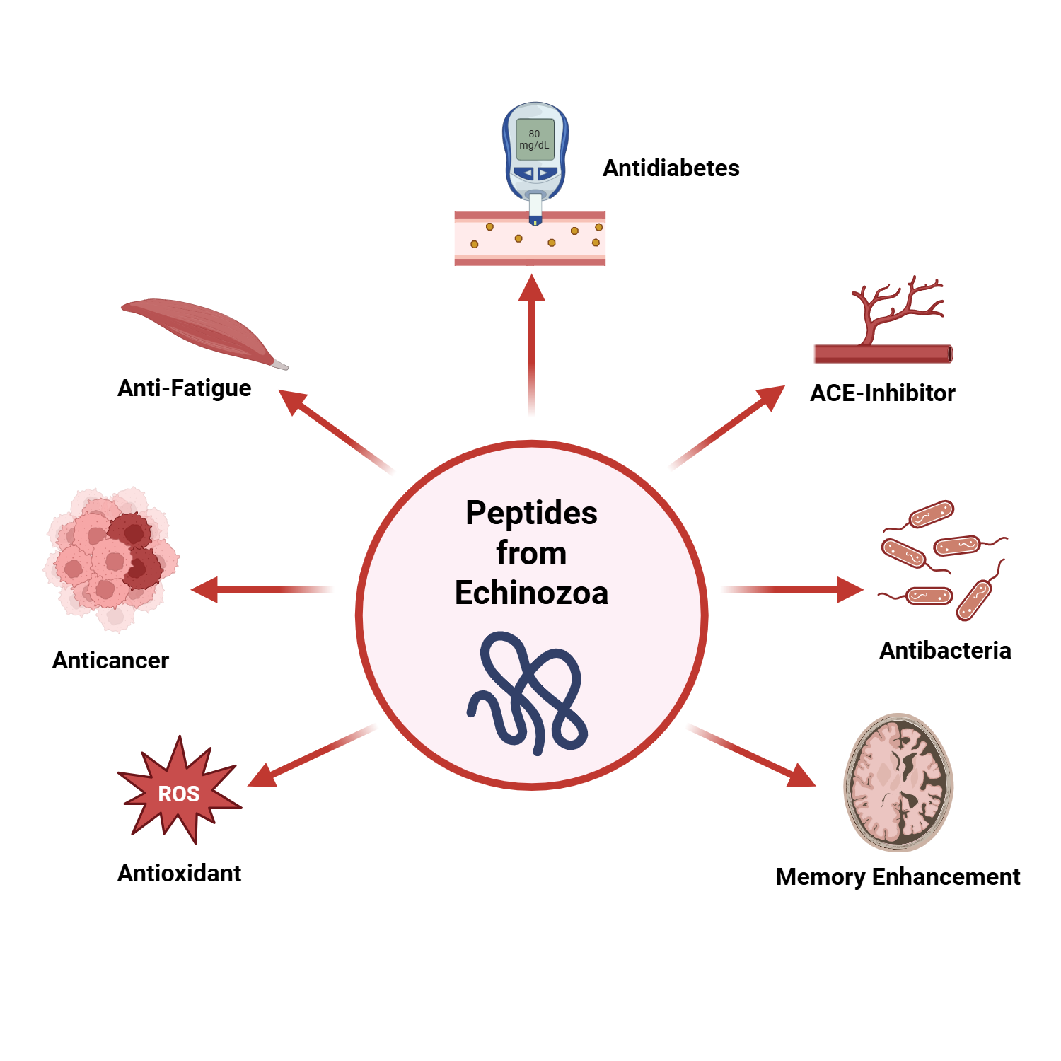 - Echinozoa peptides offer antioxidant, anticancer, antidiabetes, antifatigue, ACE-inhibitor, antibacterial, and memory-boosting properties.