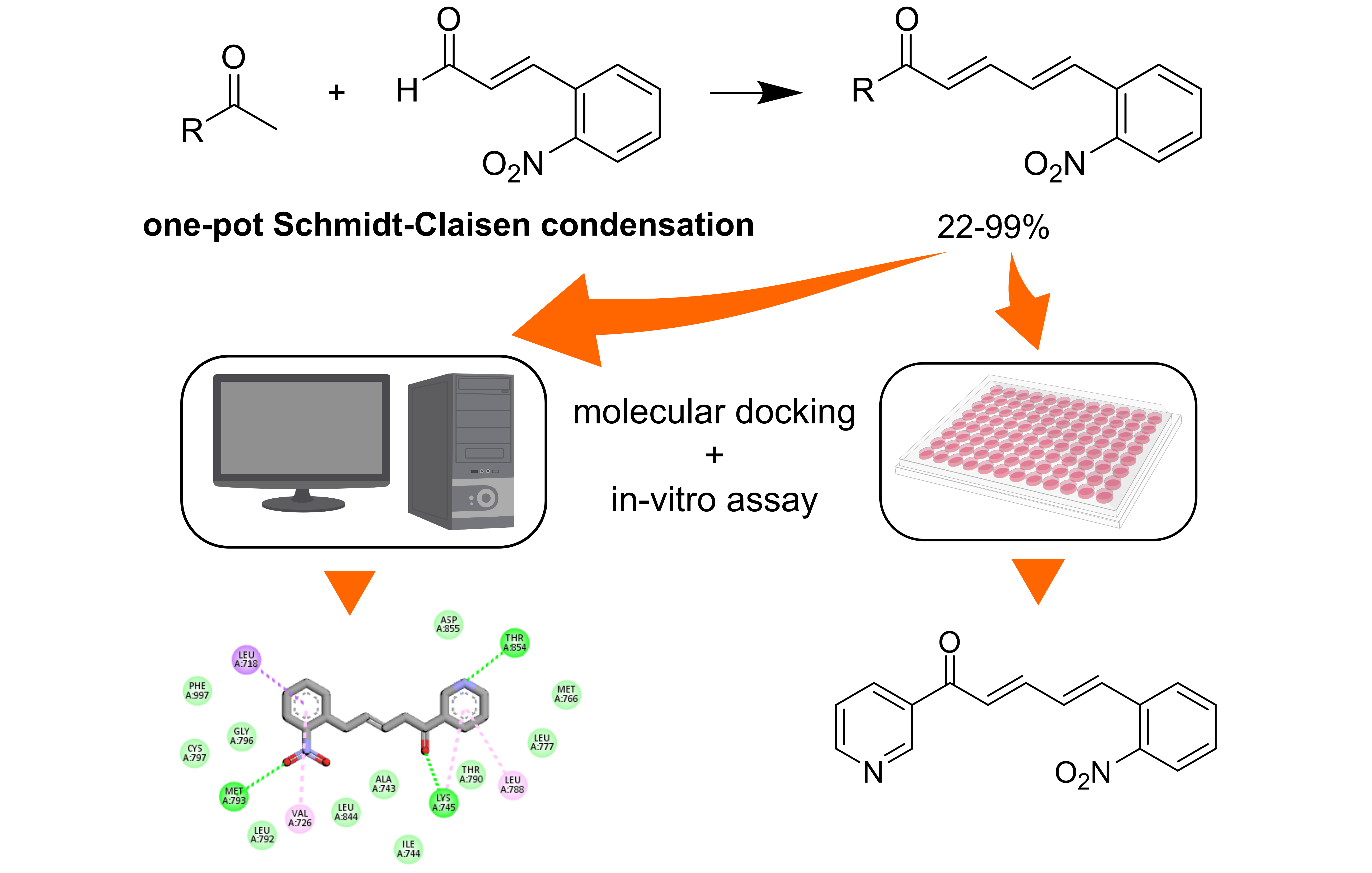 Conventional and systemic treatments of breast cancer are commonly found to expose unexpected side effects. Thus, a new drug design is intensively explored to anticipate the related risks. This work aimed to synthesize and characterize the chalcone derivatives based on a cinnamaldehyde skeleton (9 - 12). Further biological assay of the derivatives against MCF-7 breast cancer cell lines and their molecular docking analysis was also performed to obtain a more potential chemical structure for the active compounds. Four compounds of a 2-Nitrocinnamaldehyde-based scaffold, 1-(4-aminophenyl)-5-(2-nitrophenyl)-penta-2,4-dien-1-one (9), 1-(4-bromophenyl)-5-(2-nitrophenyl)-penta-2,4-dien-1-one (10), 5-(2-nitrophenyl)-1-(p-tolyl)-penta-2,4-dien-1-one (11), and 5-(2-nitrophenyl)-1-(pyridine-3-yl)-penta-2,4-dien-1-one (12) were successfully synthesized with a chemical yield of 29 - 99 %. The synthetic method employed a one-pot Claisen-Schmidt coupling reaction using a NaOH/KOH base catalyst, while their characterization was based on spectroscopic data and literature comparison. An in-vitro MTT bioassay against MCF-7 cancer cells revealed the IC50 values of the derivatives of 9, 10, 11, and 12 were 178, 376, >500, and 118.20 μg/mL, respectively. Molecular docking showed that the most potent compound in this series (12) had the lowest binding energy (–8.56 kcal/mol) and created an essential H-bond with hinge region residue, Met793. Docking-based structural optimization of 12 showed that incorporating 3 important pharmacophores commonly found in EGFR kinase inhibitors, fused heterocyclic, hydrophobic group, and propylmorpholine moiety, resulted in lower binding energy (–9.41 kcal/mol). Perhaps the modified 12 could exhibit a more potent toxicity against MCF-7.